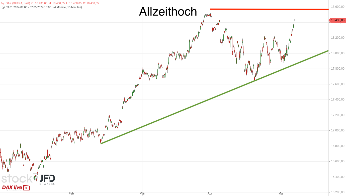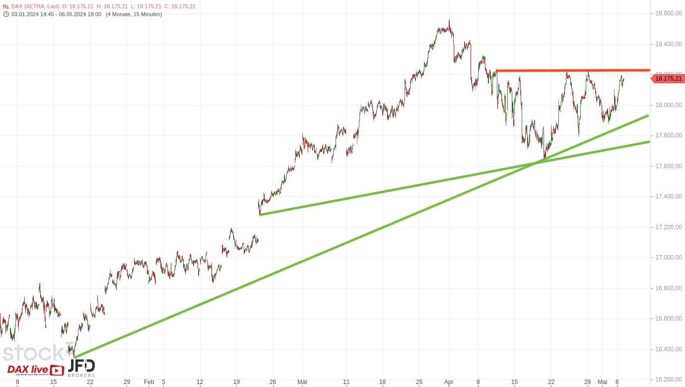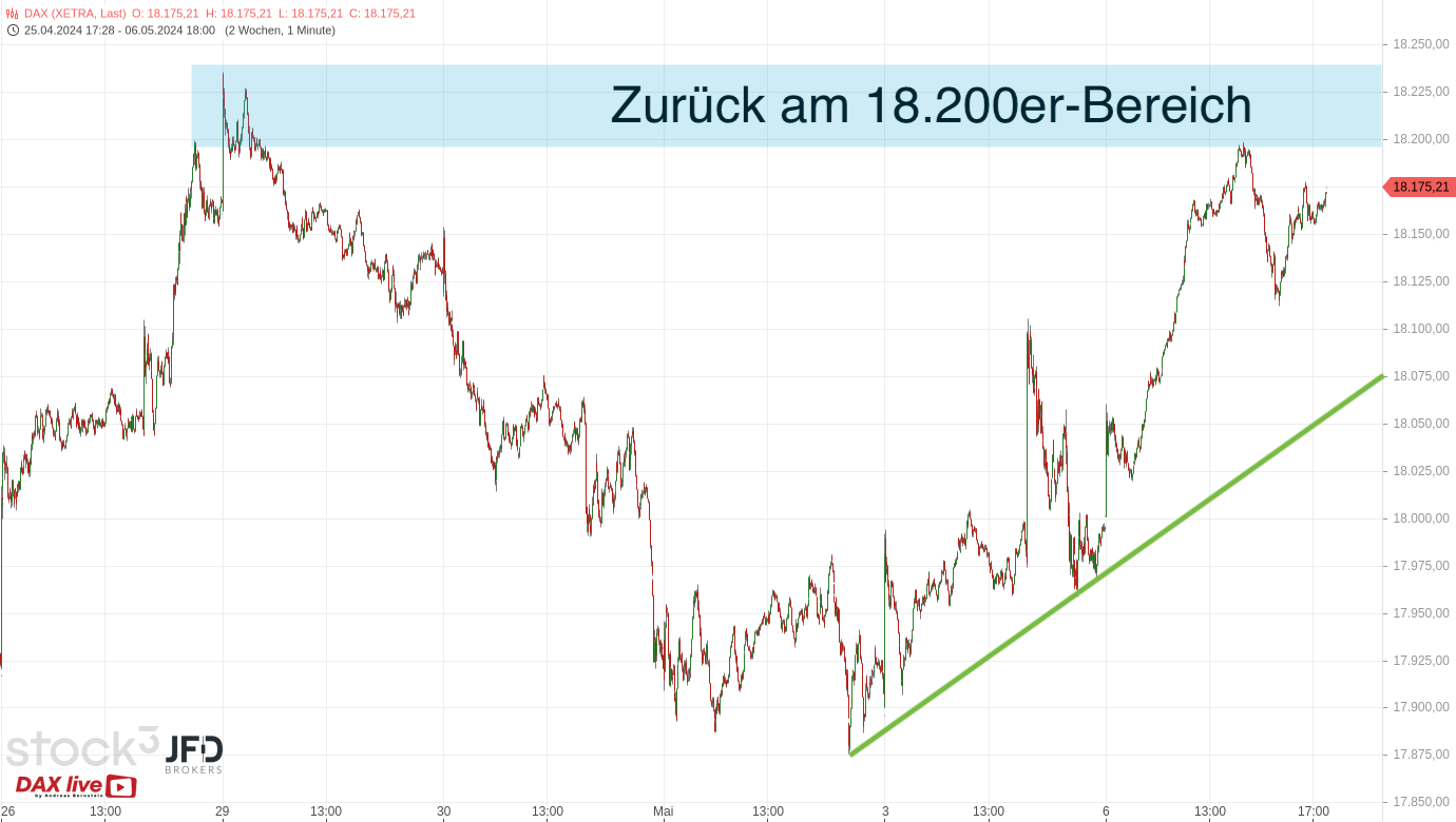 Ab dem Freitag war im DAX eine deutliche Erholung, die im Zusammenhang mit den US-Arbeitsmarktdaten stand, zu sehen. Dabei konnte die 18.000 per Schlusskurs überschritten und als nächstes Ziel die 18.200 aktiviert werden. Wir sprachen über diese Konstellation in der Morgenanalyse vom 07.05.2024 und mit diesem Chartbild (Rückblick):