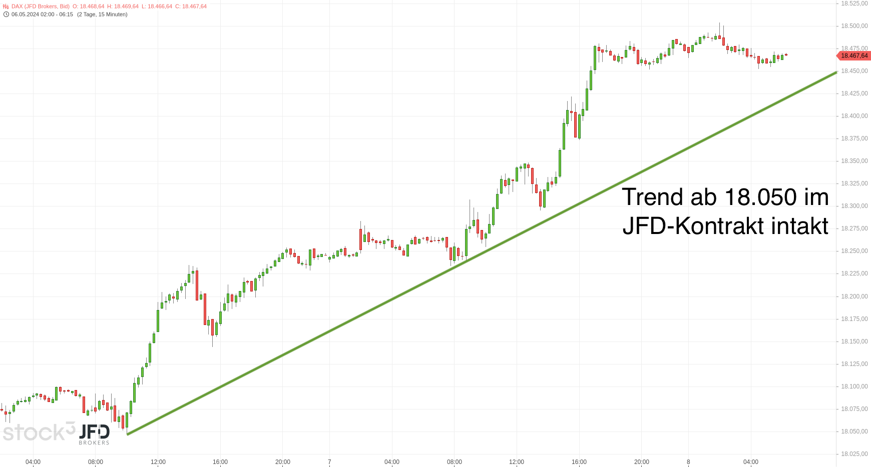 Es zog weitere Käufe an und übersprang zum Mittag die 18.300 und machte auch an der 18.400 nicht Halt. Der sehr bullische Tag folgte damit der Bewegung des Aufwärtstrends seit dem Freitag: