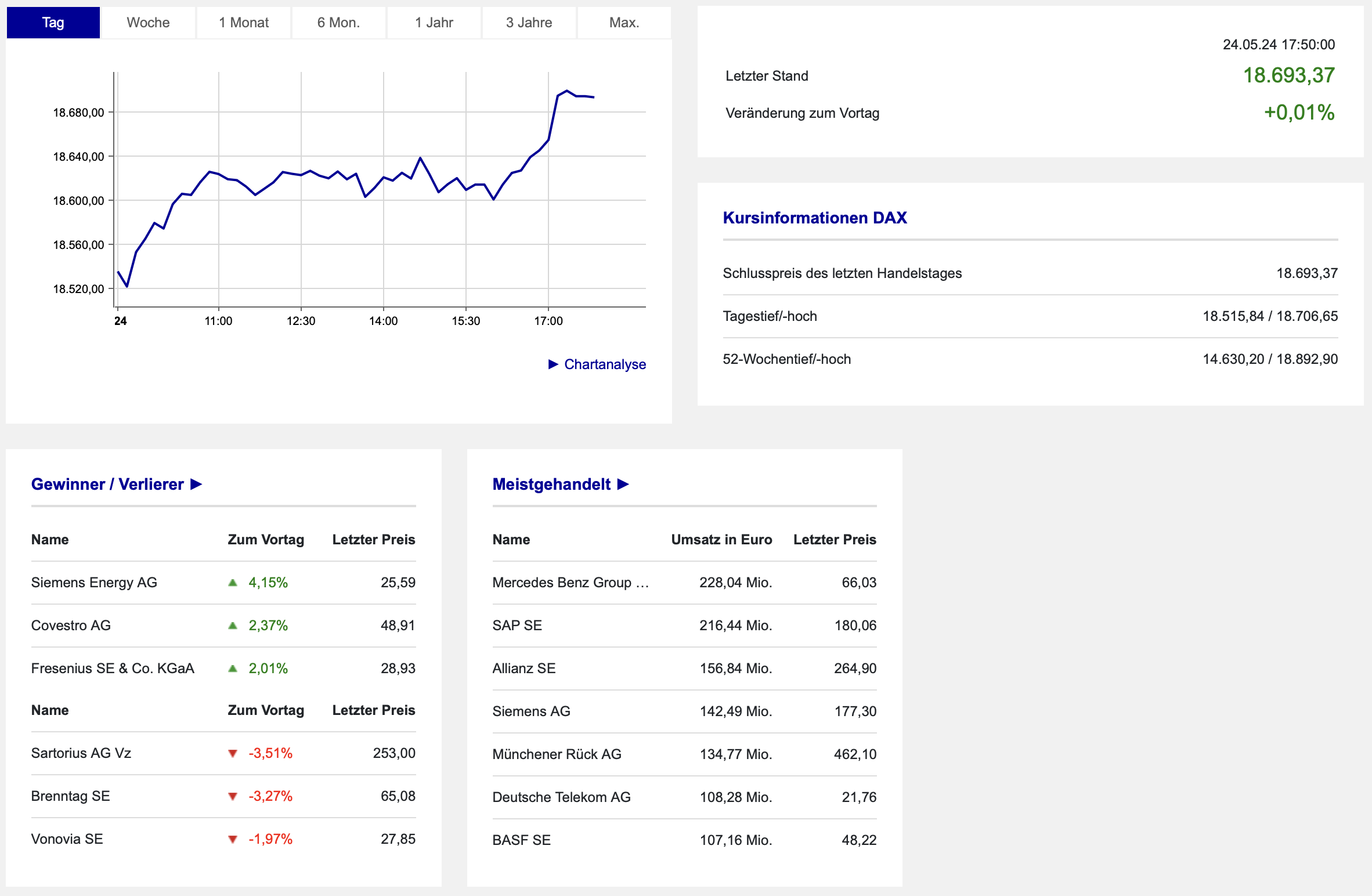 Doch bis zum Mittag wurde diese Schwelle und damit die 18.630 angelaufen und am Nachmittag sogar deutlicher überschritten. Alle Verluste konnten ausgeglichen werden, wie das leichte Plus anhand der Daten der Börse Frankfurt aufzeigt: