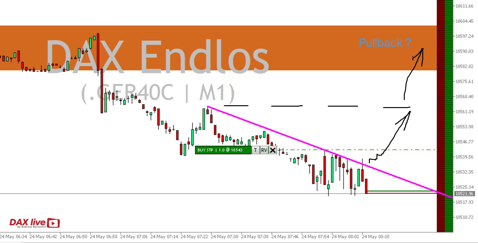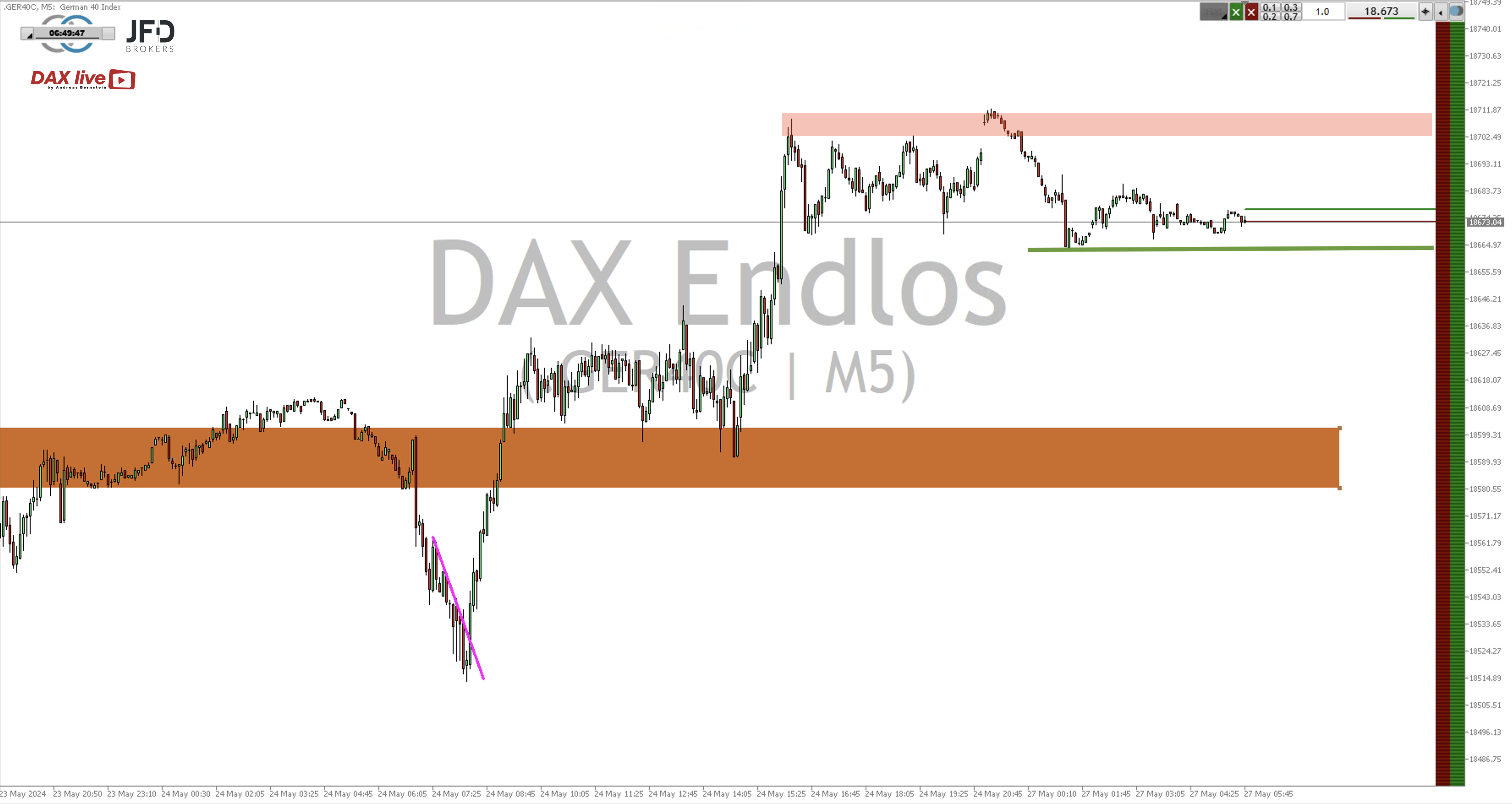 Auf die Unterstützung aus den letzten beiden Wochen schauten wir täglich und hatten dort auch einige Trades verankert. Sie war noch am Donnerstag sehr präsent, wie der Rückblick auf die Morgenanalyse vom 23.05.2024 zeigt: