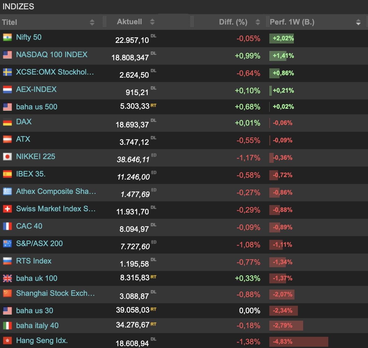 Ebenfalls unverändert ging der DAX damit aus der gesamten Handelswoche. Dies ist in der Wochenzusammenfassung der Indizes zu sehen: