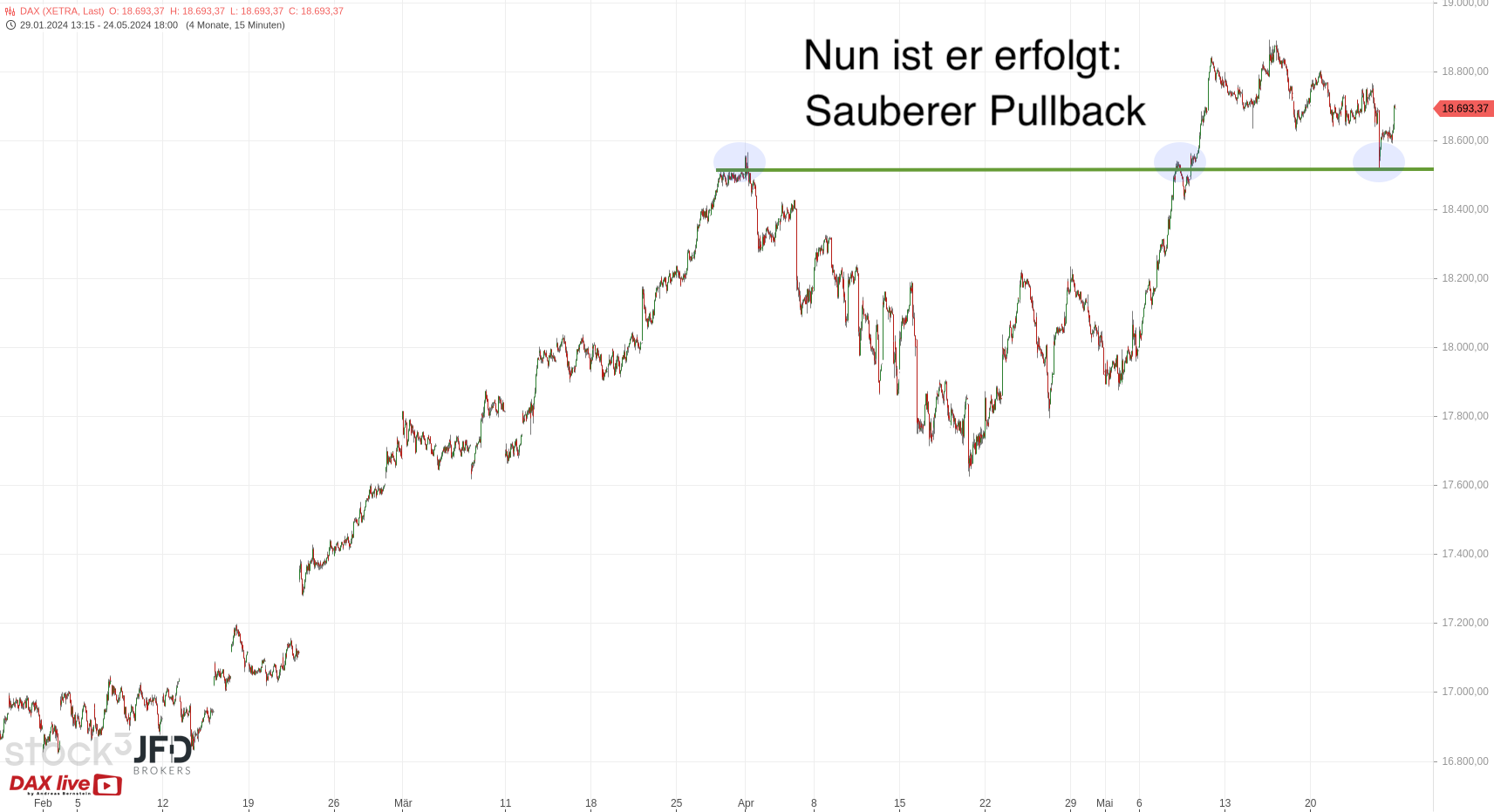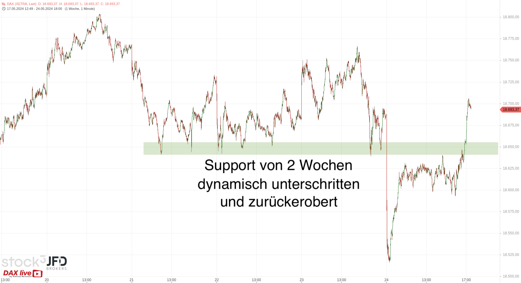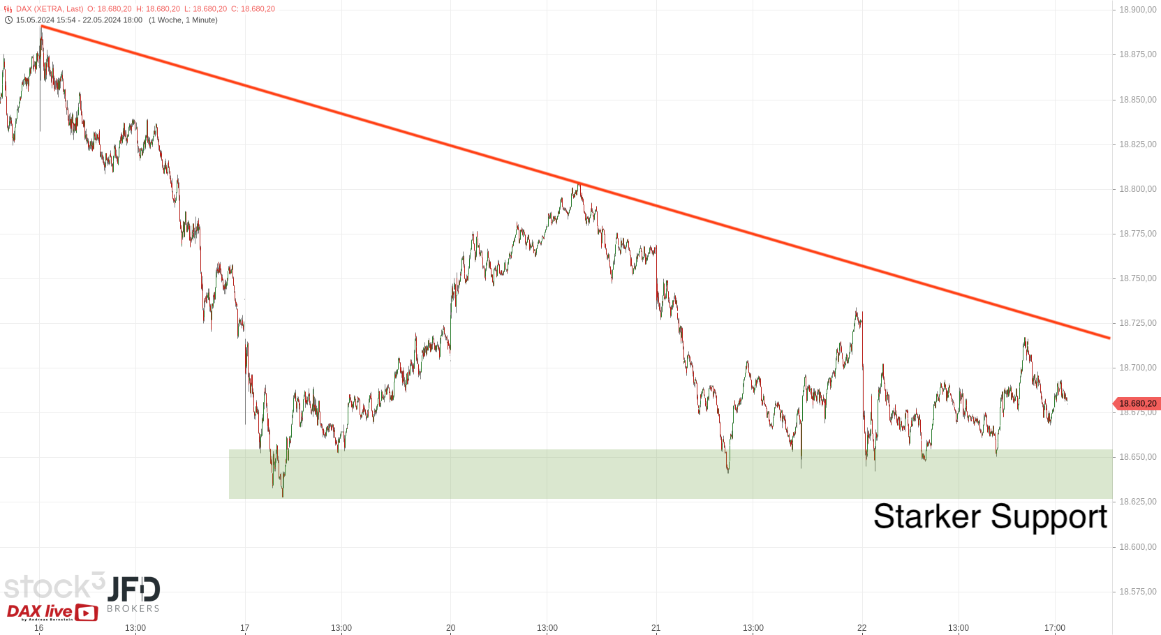Für den Wochenstart ist die 18.700 damit relevant und darunter auch ein Rücklauf an die gezeigte Unterstützung denkbar. Hier ist die JFD-Vorbörse mit dem Nachthandel abgebildet::