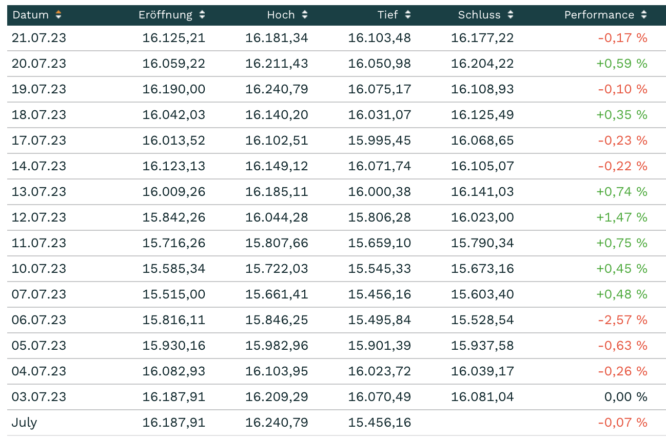 Per Saldo für den Monat Juli ist hierbei keine Bewegung zu sehen. Wir notieren auf dem gleichen Level wie zum Monatsstart. Hier siehst Du die Tageszusammenfassung der jeweiligen Handelstage auf dem Handelsplatz XETRA: