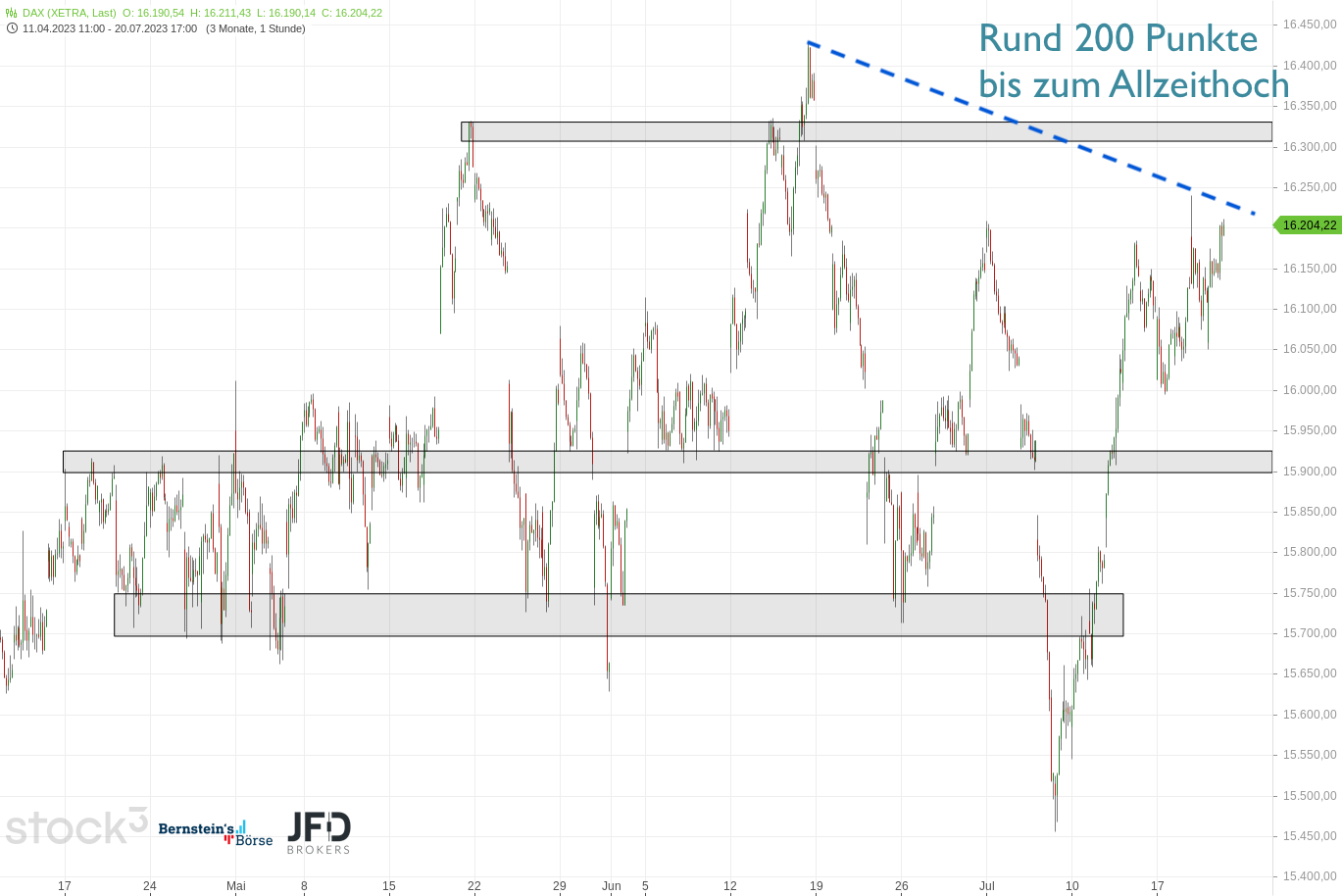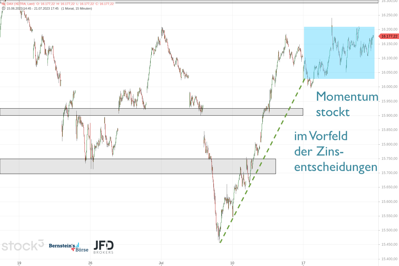 Mit dem Überschreiten des DAX von 16.000 Punkten ebbte die Dynamik der Bewegung deutlich ab und der Index ging in eine Seitwärtsphase über. Das abgeflachte Momentum ist nun deutlich im Stundenchart zu sehen: