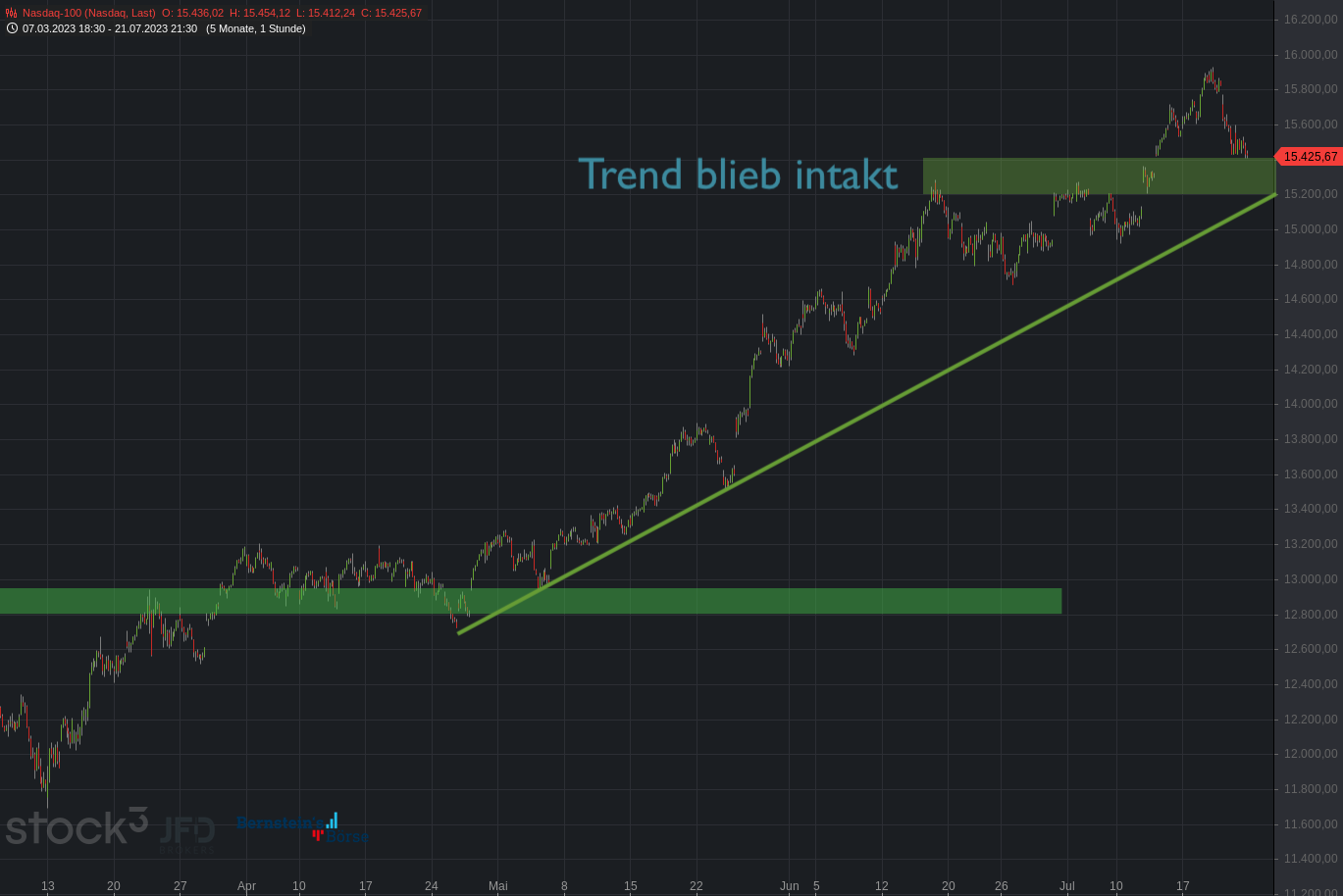 Übergeordnet war dabei das Big Picture erneut mit den Zonen der letzten Monate eine gute Orientierung und gibt weitere Ableitungen, wohin die nächste Bewegung verlaufen könnte. Da eine Seitwärtskonsolidierung oftmals nur eine Pause einer bestehenden Bewegung ist, könnte diese im nächsten Schritt zur 16.300 fortgesetzt werden und das darüberliegende Allzeithoch ebenfalls als Ziel aufgreifen: