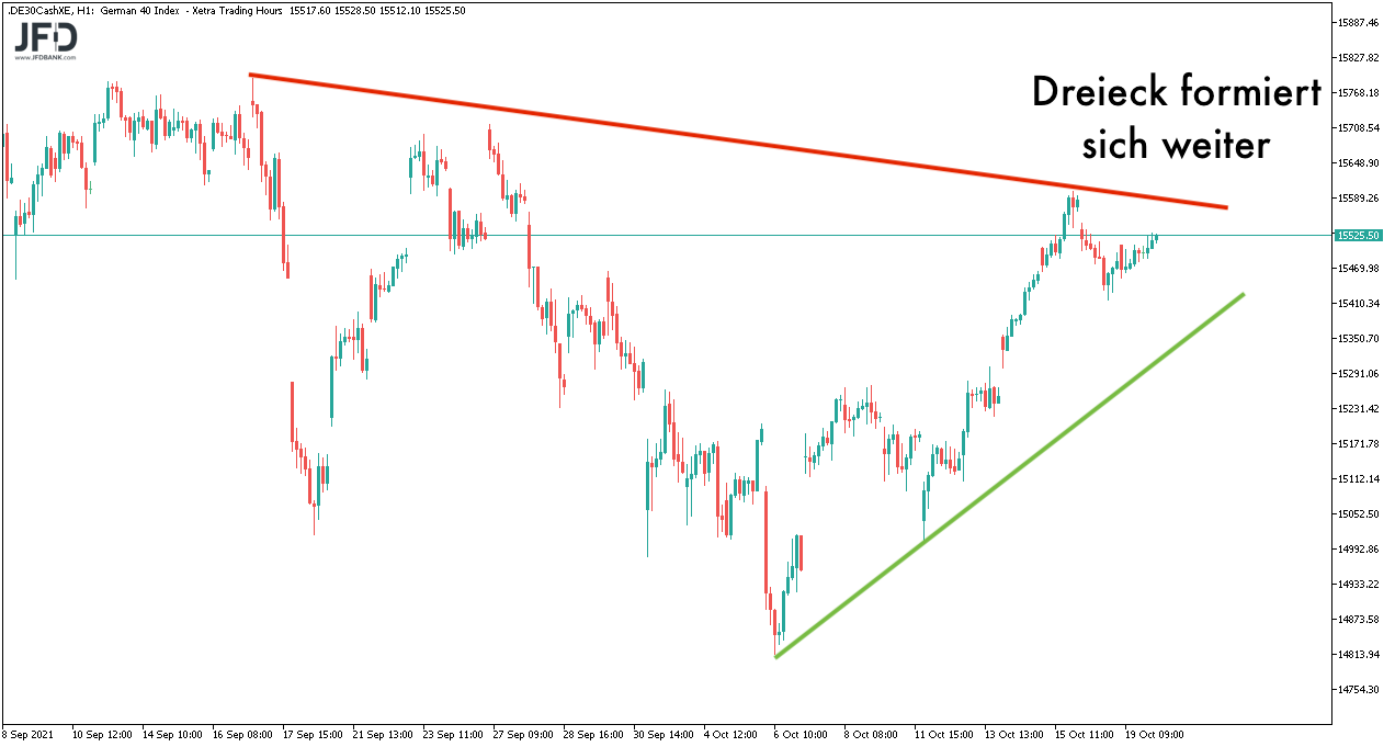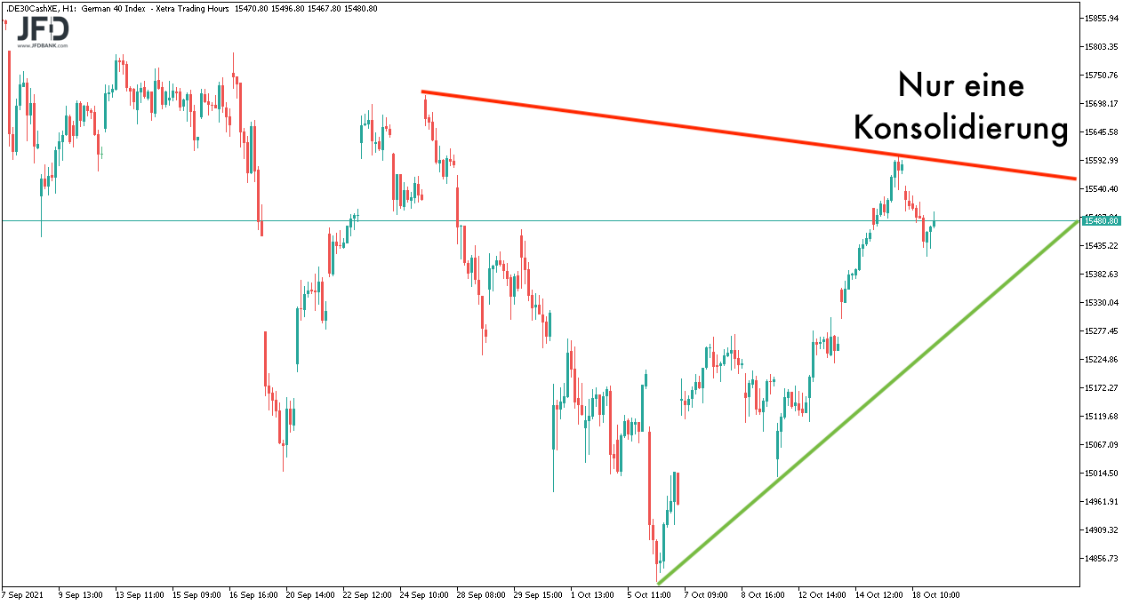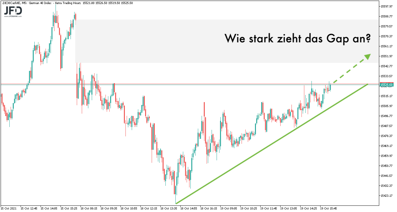 So setzte sich die Konsolidierung fort und hat auf der Oberseite das Gap vom Wochenstart im Blick sowie auf der Unterseite mit dem Aufwärtstrend ab dem unteren Gap bei 15.300 Punkten eine Orientierung: