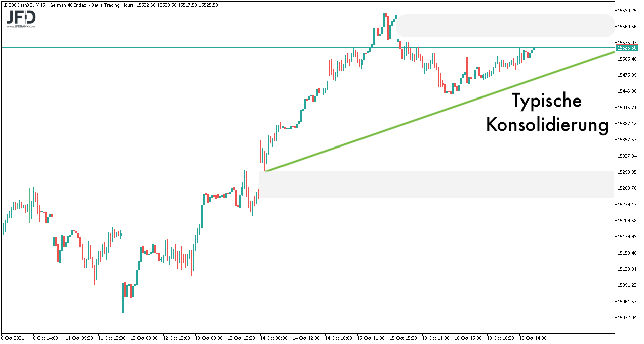 Wie lange eine Konsolidierung andauert, ist vorab schwer zu prognostizieren. Sie hat jedoch den Vorteil, dass man hier genaue Marken einziehen kann und damit Trigger hat, wann diese beendet ist. Ein weiterer Punkt ist die anstehende Dynamik, die mit einem Ausbruch verbunden ist.