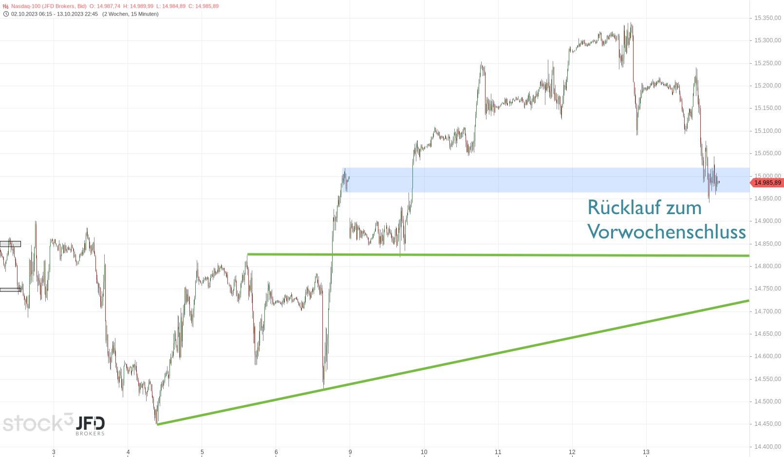 Geopolitik und Markttechnik waren damit im Einklang und ließen am Freitag alle Gewinne im Nasdaq abschmelzen, sodass wir auf dem gleichen Level (knapp unter 15.000 Punkten) aus der Woche gingen:
