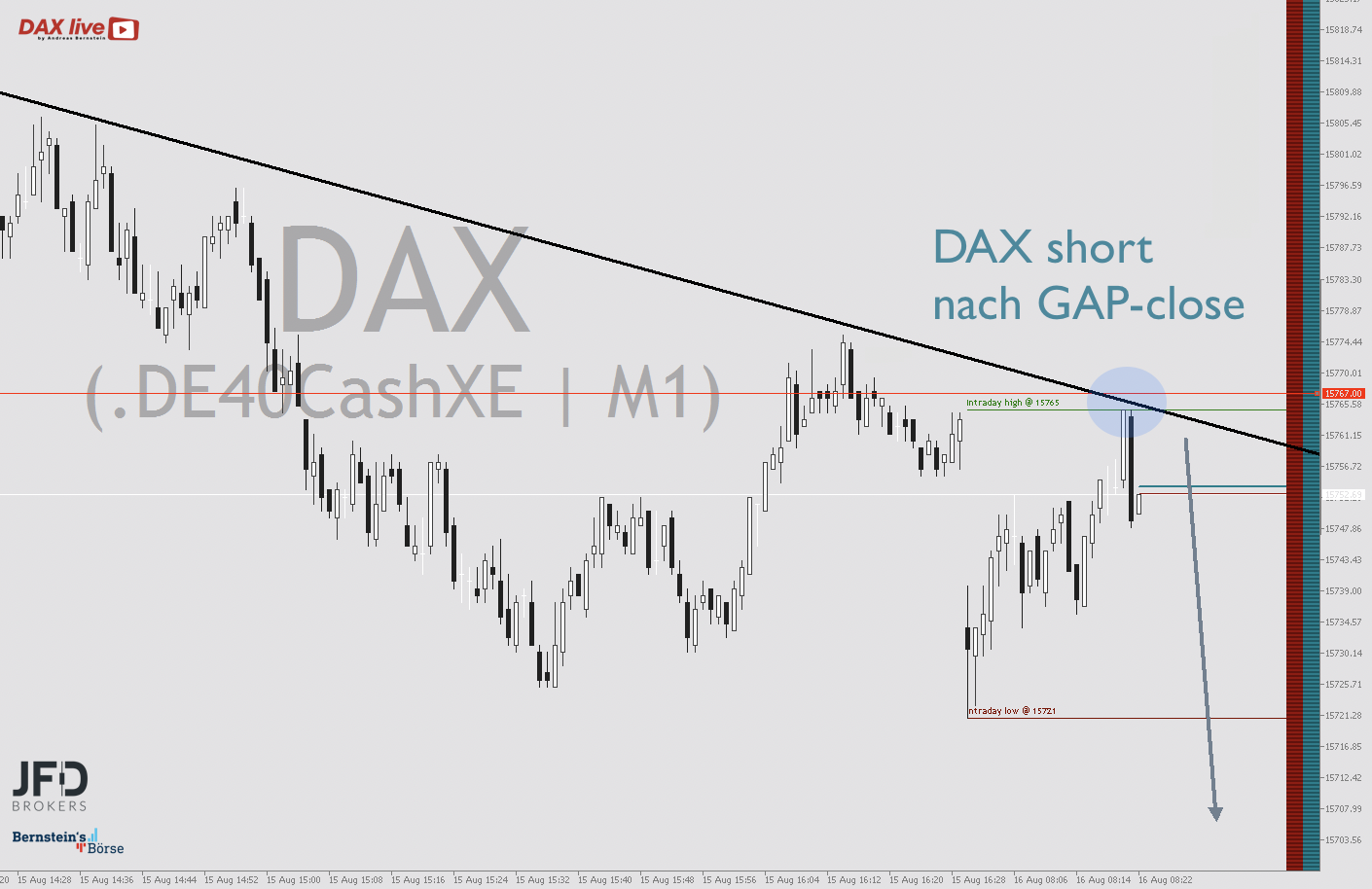 Die Vorbörse am Mittwoch zeigte sogar noch tiefere Notierungen und forcierte damit einen möglichen Bruch dieser Unterstützung. Zum XETRA-Start wurde dies geheilt und der Index zog sehr schnell in Richtung GAP-close an. An diesem Punkt setzte ich in Kombination mit dem Abwärtstrends des Vortages auf einen Rücklauf, wie dieses Chartbild für das Setup noch einmal aufzeigt: