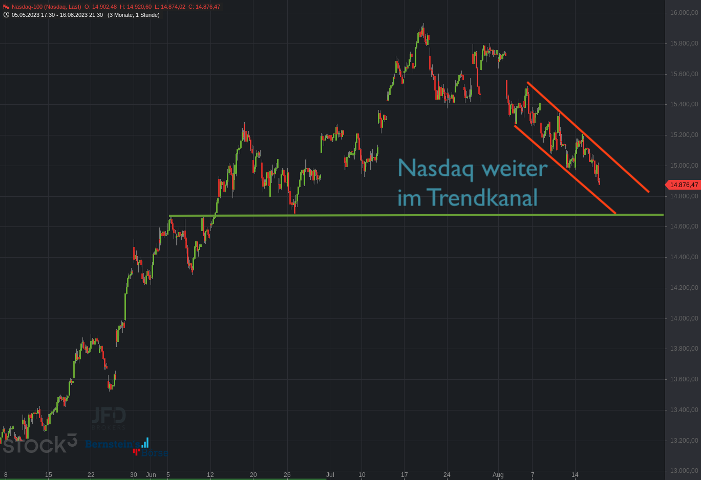 Der Nasdaq vollzog später mit neuen Verlaufstiefs seinen Trendkanal weiter zur Unterseite. Ich habe die nächste Unterstützung nach dem Bruch der 15.000er-Marke hier eingezeichnet: