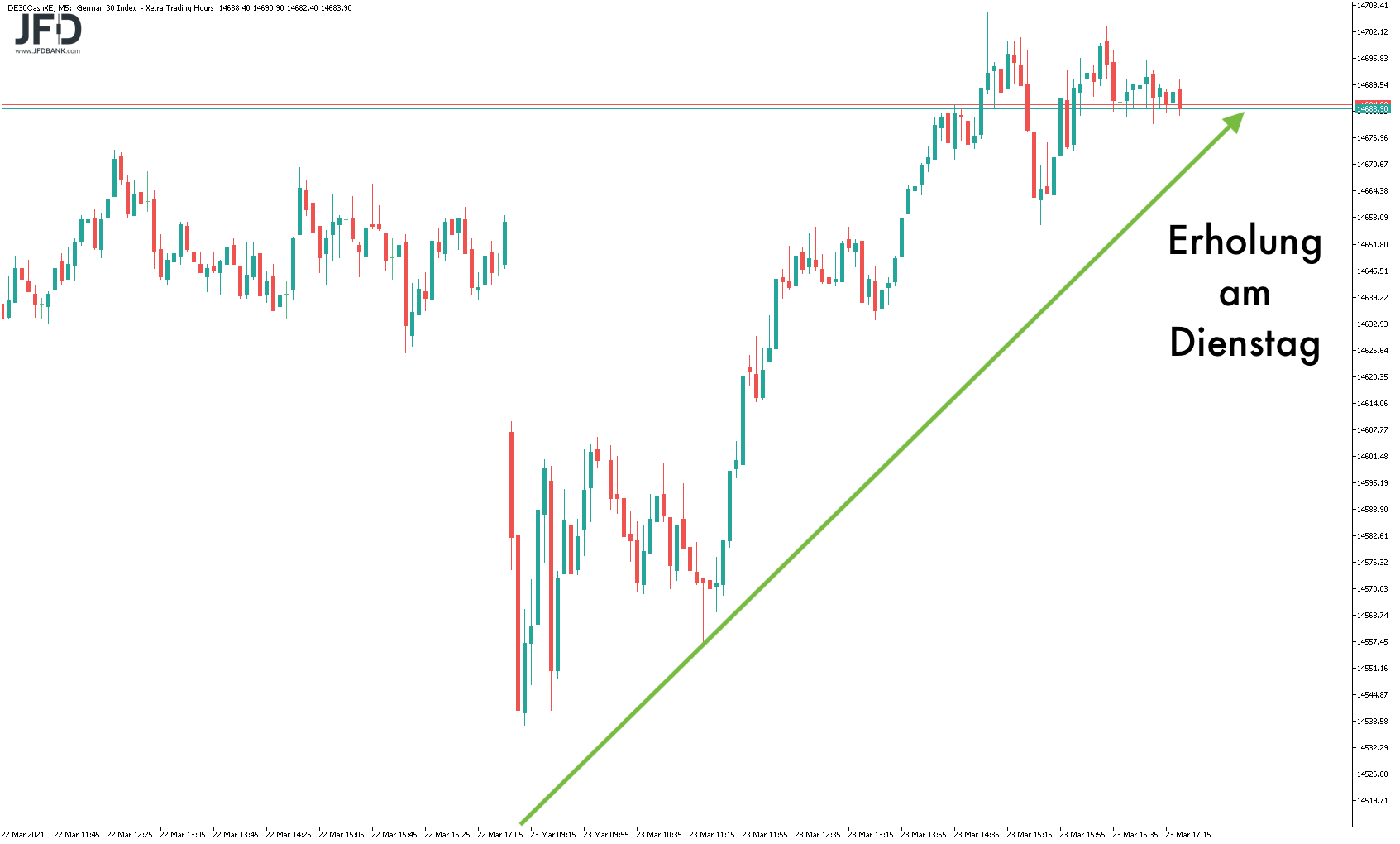 Zunächst startete der Index (genau wie der Montag) schwächer und durchbrach das Vortagestief. Doch auch darauf folgte eine schnelle Erholung. Die 14.600 skizzierte sich als bekannte Entscheidungsmarke heraus und war im Livetrading das erste Ziel meiner Positionierung: