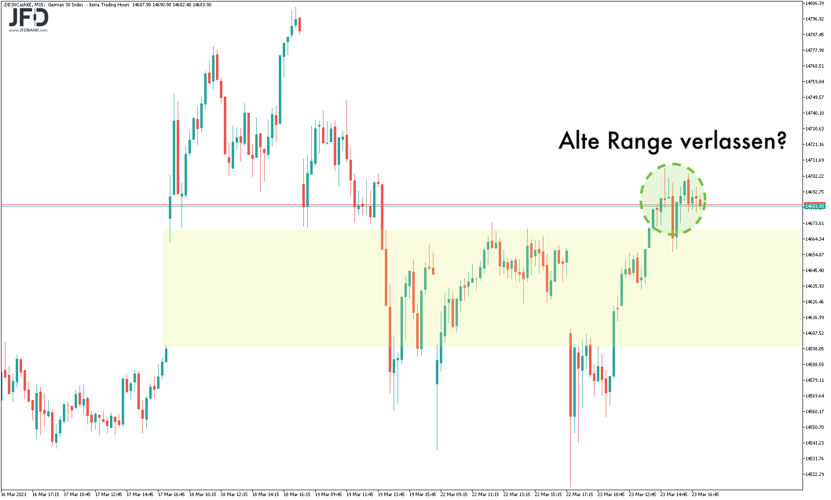 Für das Trading ist dieser gestrige Bereich des GAPs, der heute ebenfalls das GAP bilden könnte, eine erste Anlaufstelle der Prognosen. Darunter wäre die 14.600 wieder das Entscheidungslevel, an dem wir direkt starten dürften: