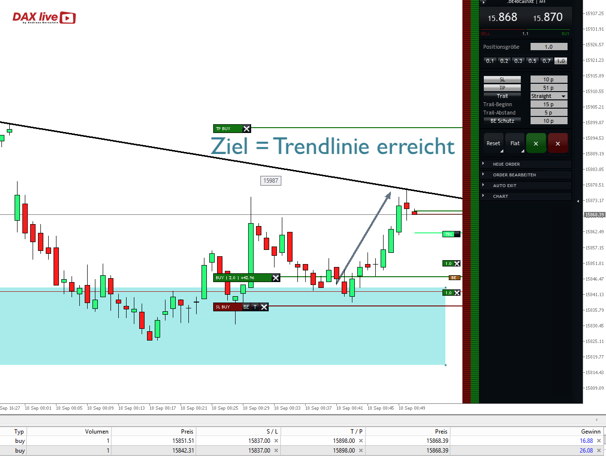 Warum ist der Bereich wichtig gewesen? Dort lag die Unterstützung vom Montagnachmittag vor genau einer Woche verankert und dort bot sich aus meiner Sicht ein Long-Setup an, was wie folgt LIVE gehandelt wurde: