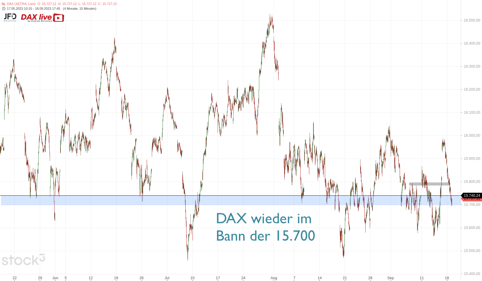Dies scheint die DAX-Anleger:innen nicht zu überzeugen. Aus der Vorbörse heraus ist eine Orientierung an den gestrigen Tiefs zu erkennen und damit die 15.700 wieder im Fokus: