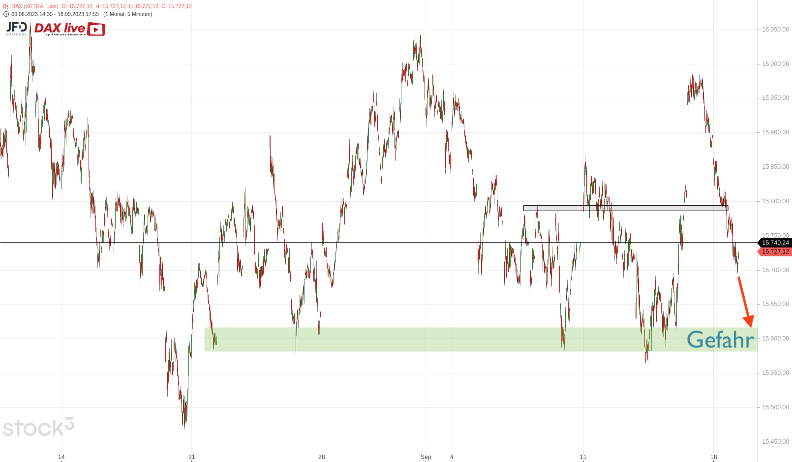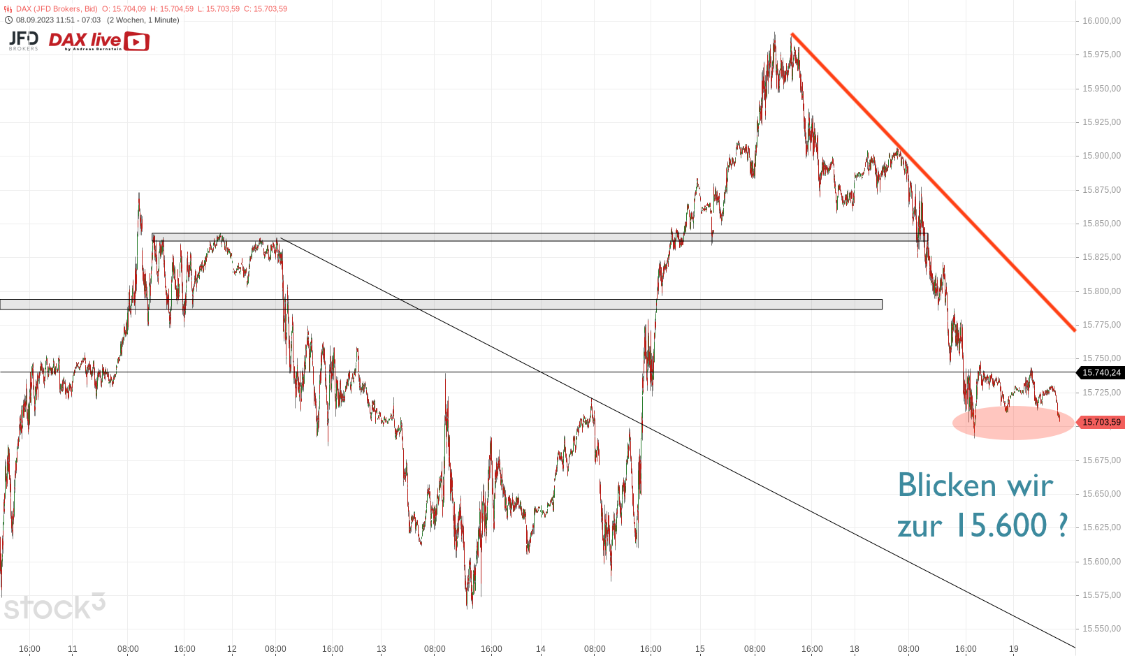 Rutschen wir unter diese Schwelle, skizziert sich im XETRA-Chart dann ein weiterer Rutsch bis zur Unterkante der breiten Range, also direkt an die 15.600er-Region heran: