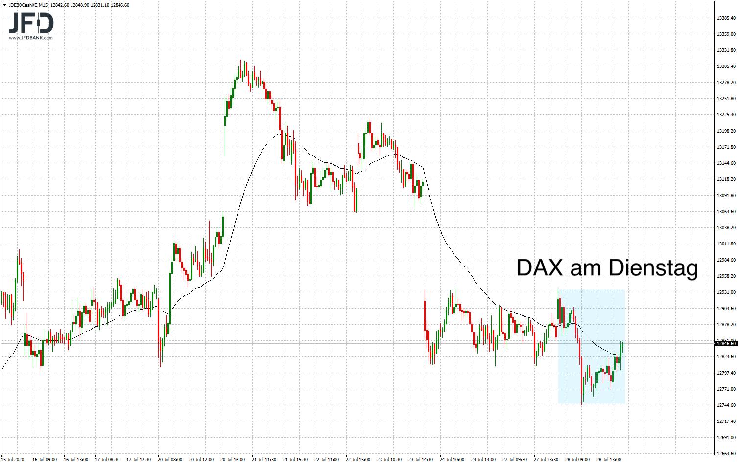 Nach zwei Tagen ohne größere Bewegungen und in einer engen Bandbreite hat der DAX am Dienstag etwas mehr Dynamik gezeigt. Er vollzog auf der Oberseite einen Anlauf, das GAP zu vergangenen Donnerstag zu schließen und tangierte die 12.935 genau, jedoch ohne in das GAP einzudringen.