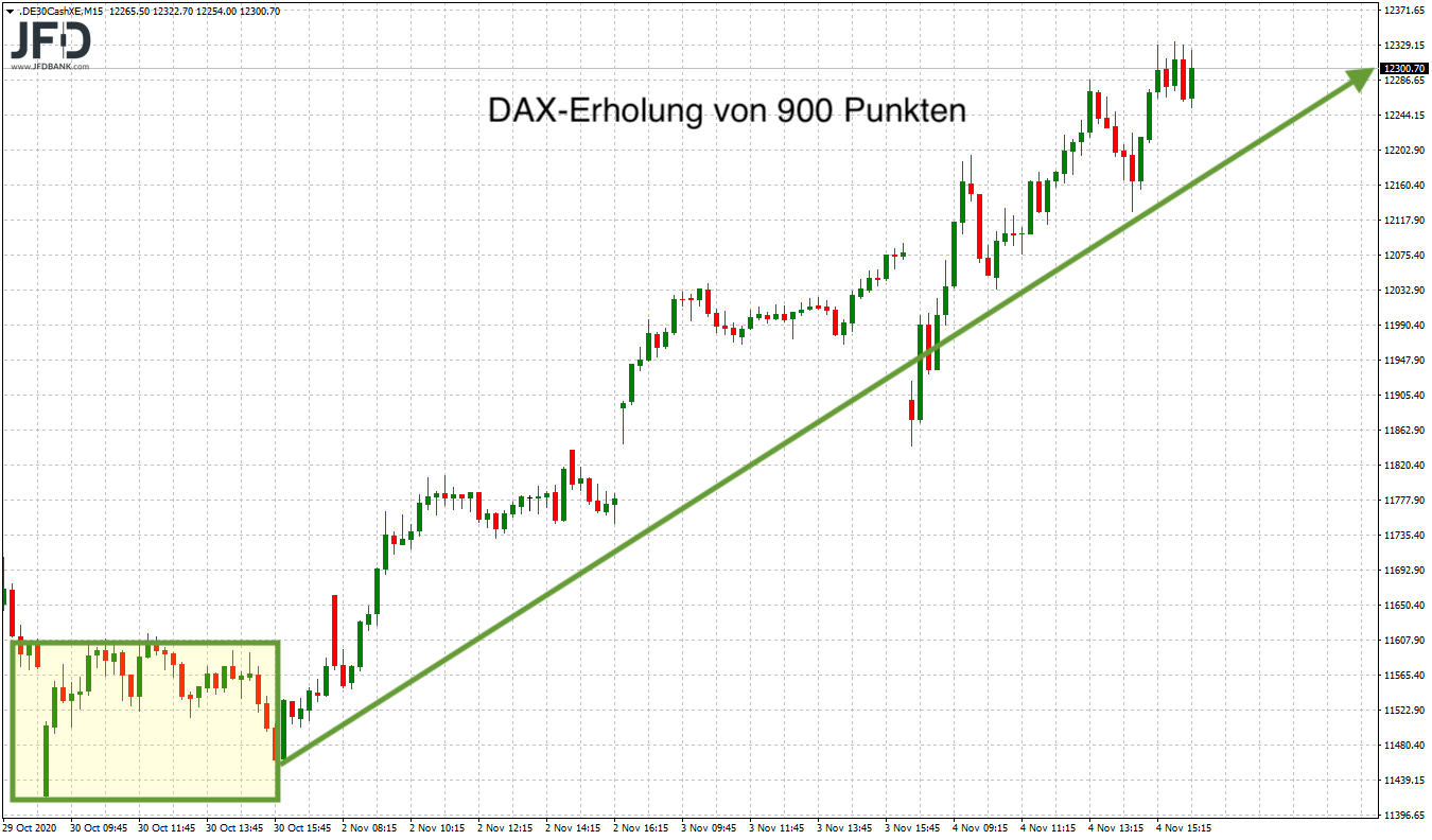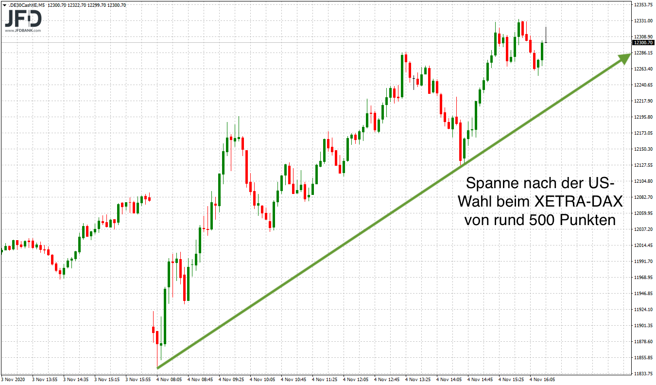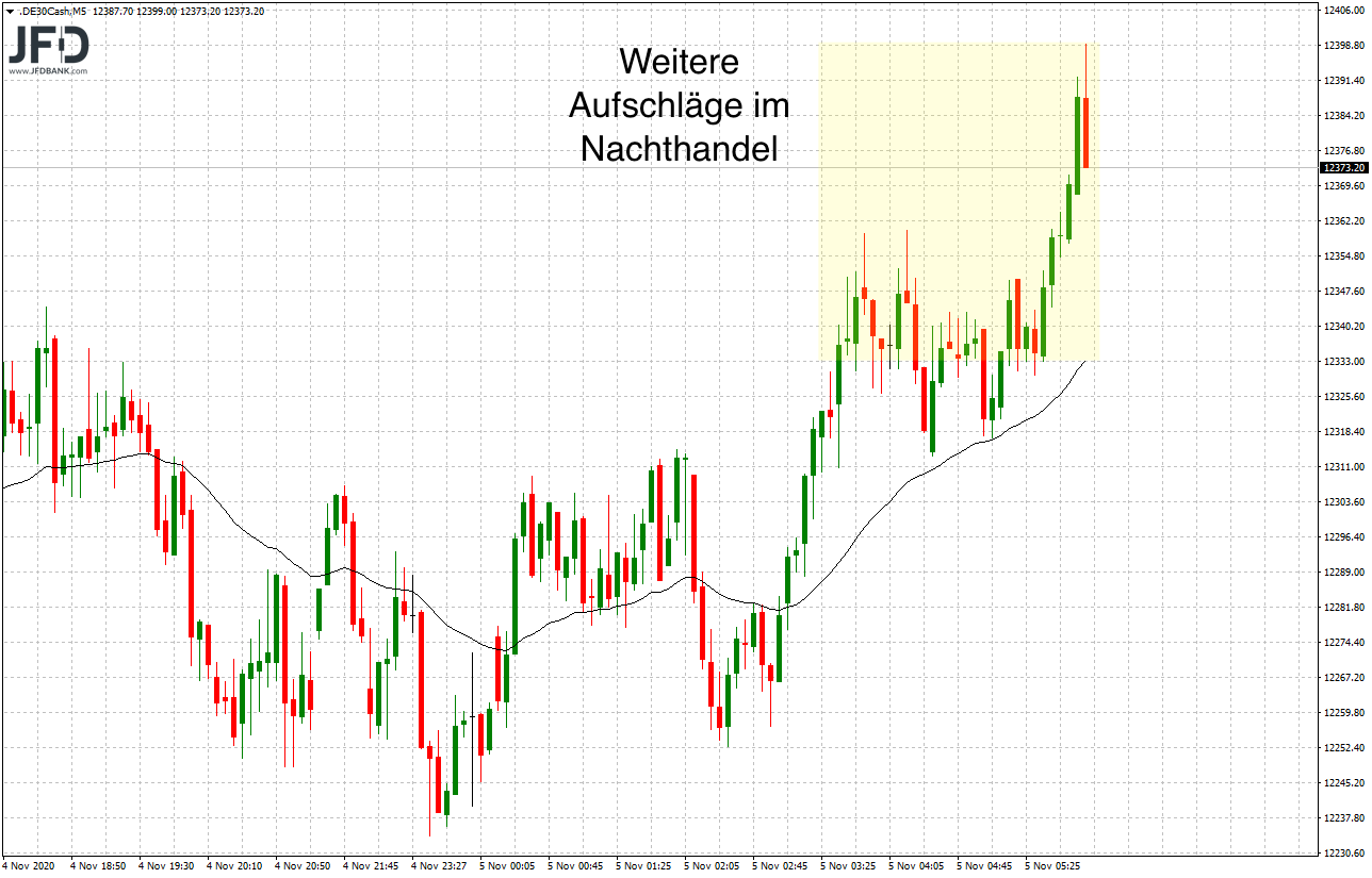 Die ersten Hochrechnungen haben sich nicht bewahrheitet. Es gab bei der Wahl zum US-Präsidenten keine klare Entscheidung und die Auszählungen dauern aktuell noch an. Im Zuge dieser Erkenntnis fiel der Aktienmarkt zunächst und markierte vorbörslich die 11.800. Erst wenig später sprang er an und strebte wieder zur runden 12.000er-Marke.