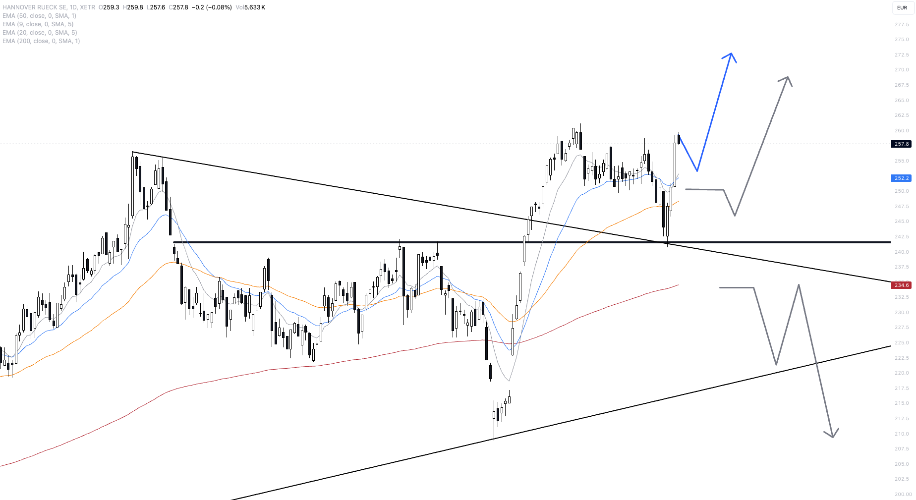 Unser Hauptszenario sieht vor, dass die Aktie knapp unter dem Allzeithoch für wenige Tage innehält, bevor sie dann dynamisch auf neue Hochs ausbricht. Ein realistisches Ziel dieser Ausbruchbewegung kann im Bereich von 280 Euro ausgemacht werden.