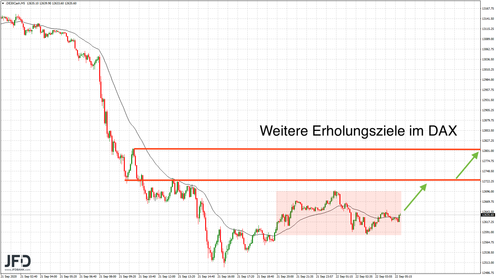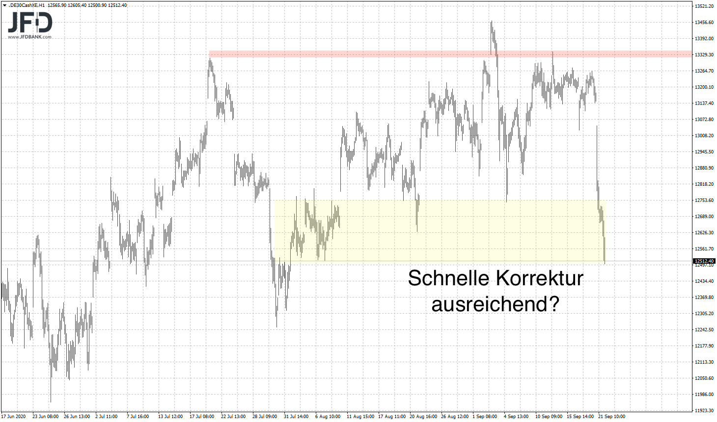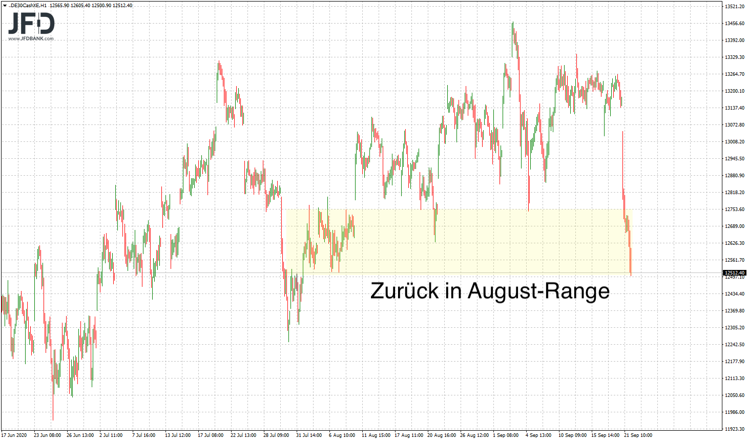 So tauchte der DAX charttechnisch direkt in seine alte Range aus dem August ein und fiel im Tief bis zu deren unteren Begrenzung knapp über 12.500 Punkte: