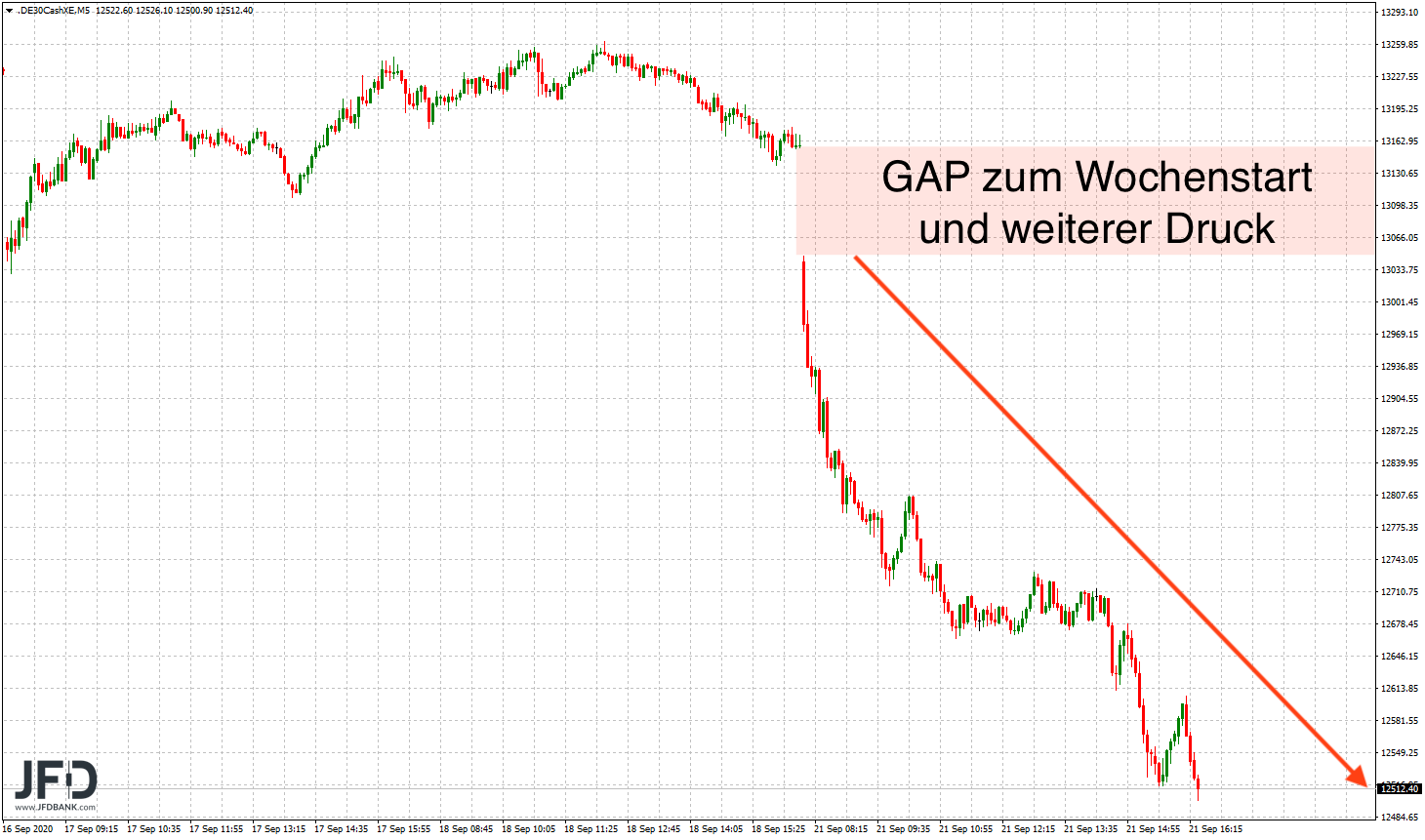 Bereits der Xetra-Start ließ eine negative Stimmung vermuten. Die 13.000 wurde direkt unterschritten, doch welches Momentum daraus entstehen würde, hatten sicherlich nur wenige Marktteilnehmer geahnt. Bereits in der ersten Handelsstunde fielen die 12.900 und bis zum Mittag weitere Hunderter-Marken. Eine Erholung setzte nur geringfügig ein und mit der Eröffnung der Wall Street verpuffte diese gänzlich. Der Druck wurde fortgesetzt und das GAP komplett ignoriert: