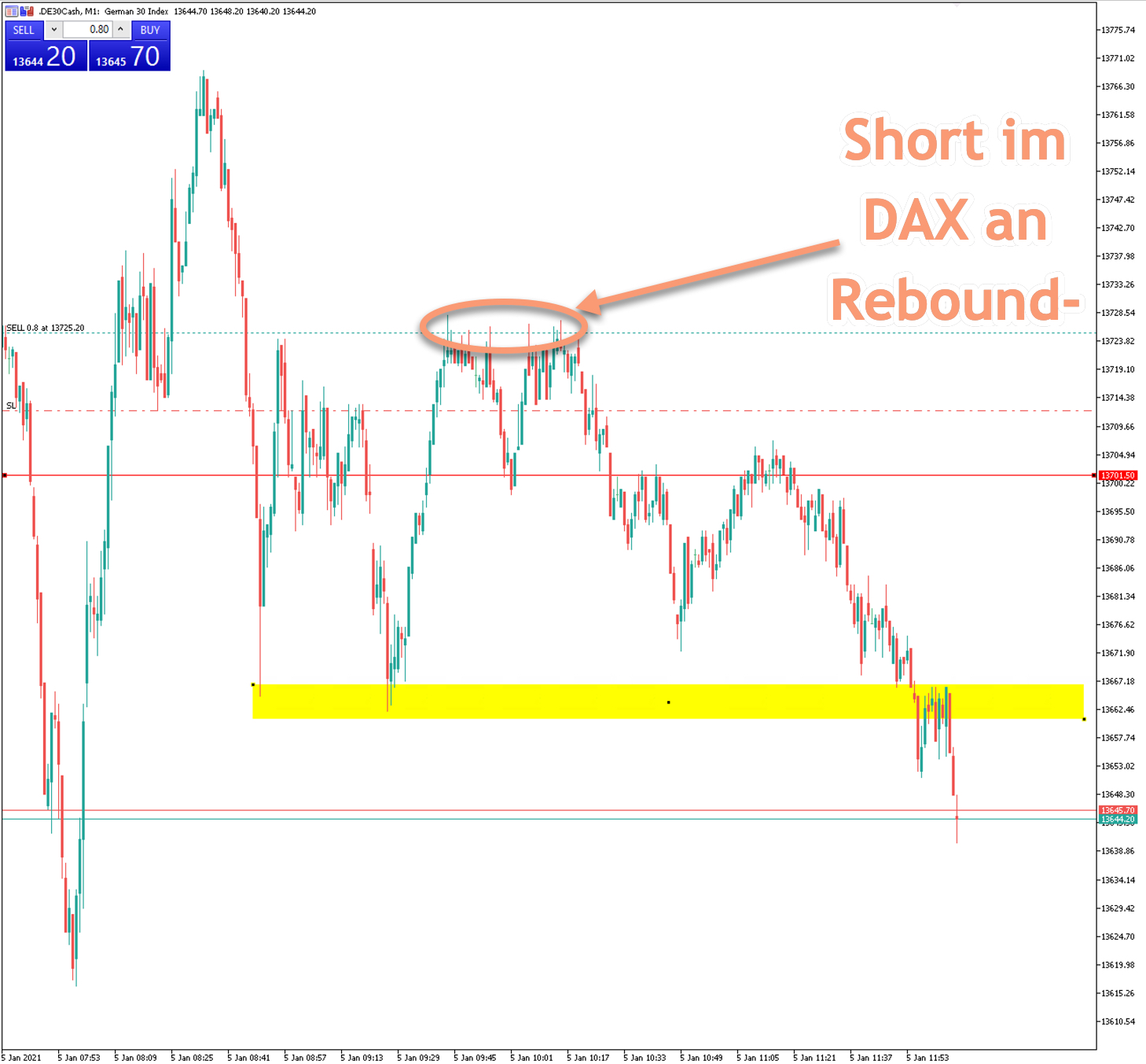 Bereits nach 10.30 Uhr setzte erneut Schwäche ein. Im Livetrading-Webinar hatten wir dies entsprechend besprochen und mit einer Short-Order umgesetzt, die über die Mittagszeit dann direkt in den Zielbereich lief: