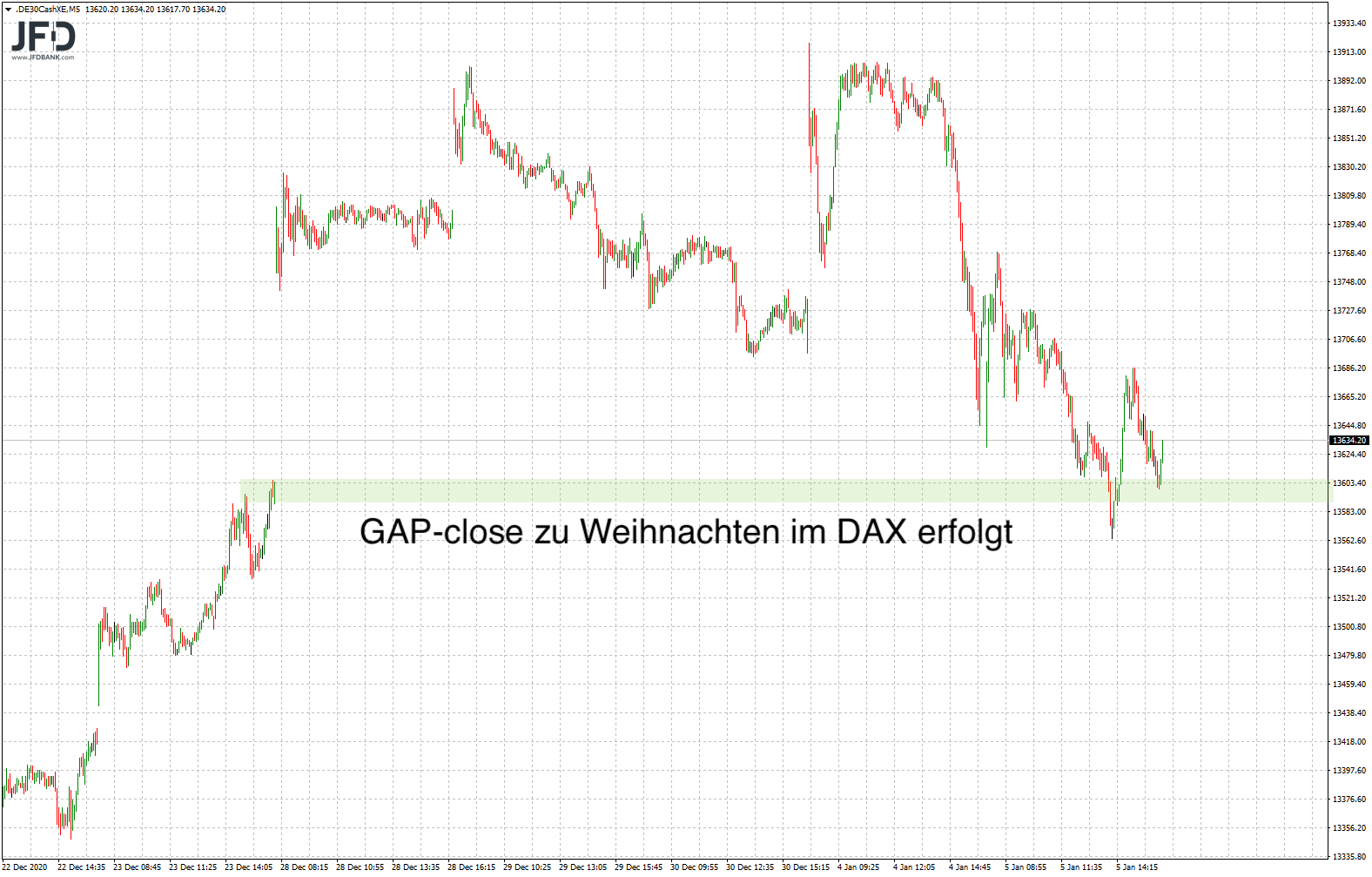 Bei 13.566 Punkten gab es dann ein dynamisches Tief und eine Erholung an genau diesem Bereich, welche sich wie folgt darstellte: