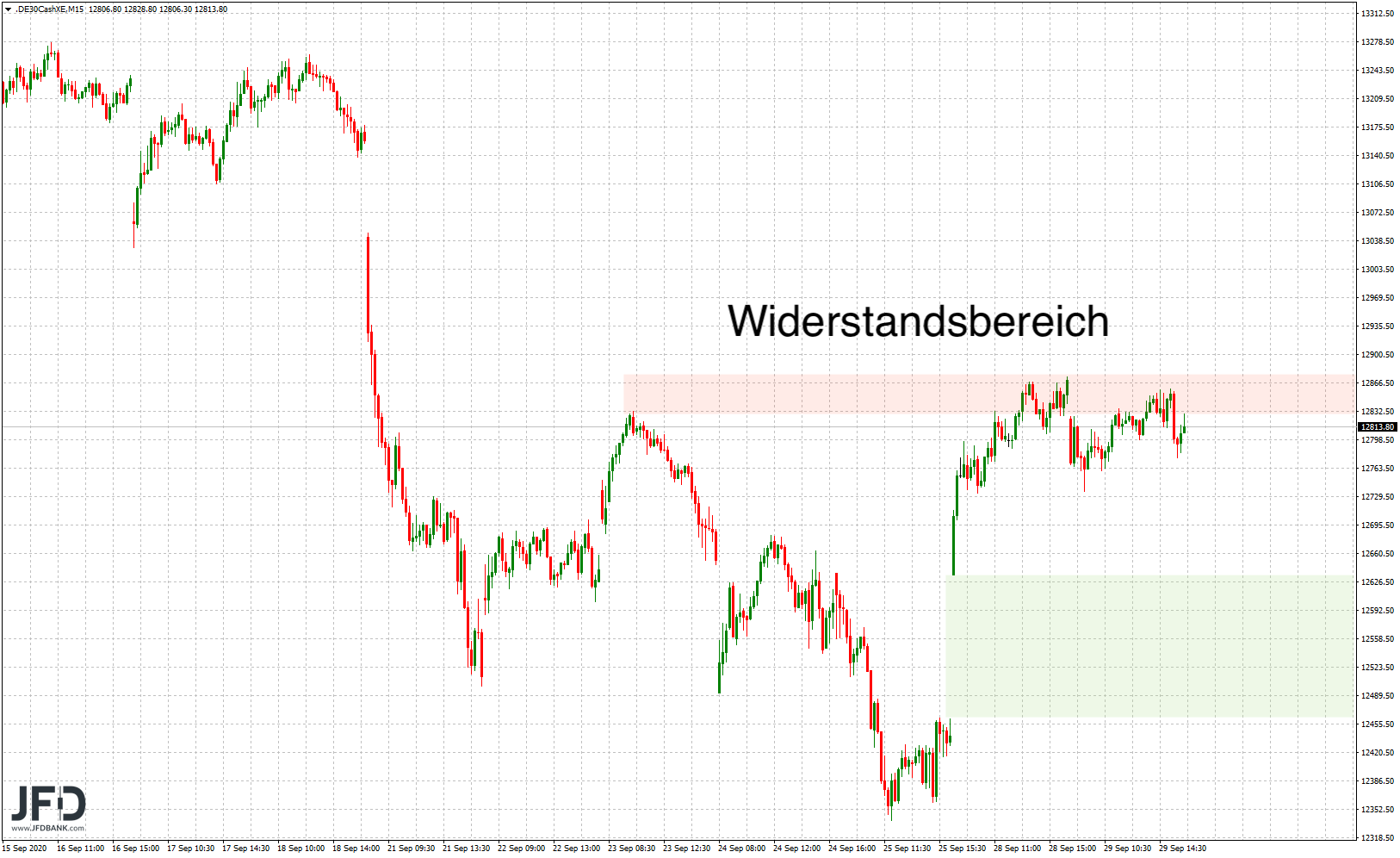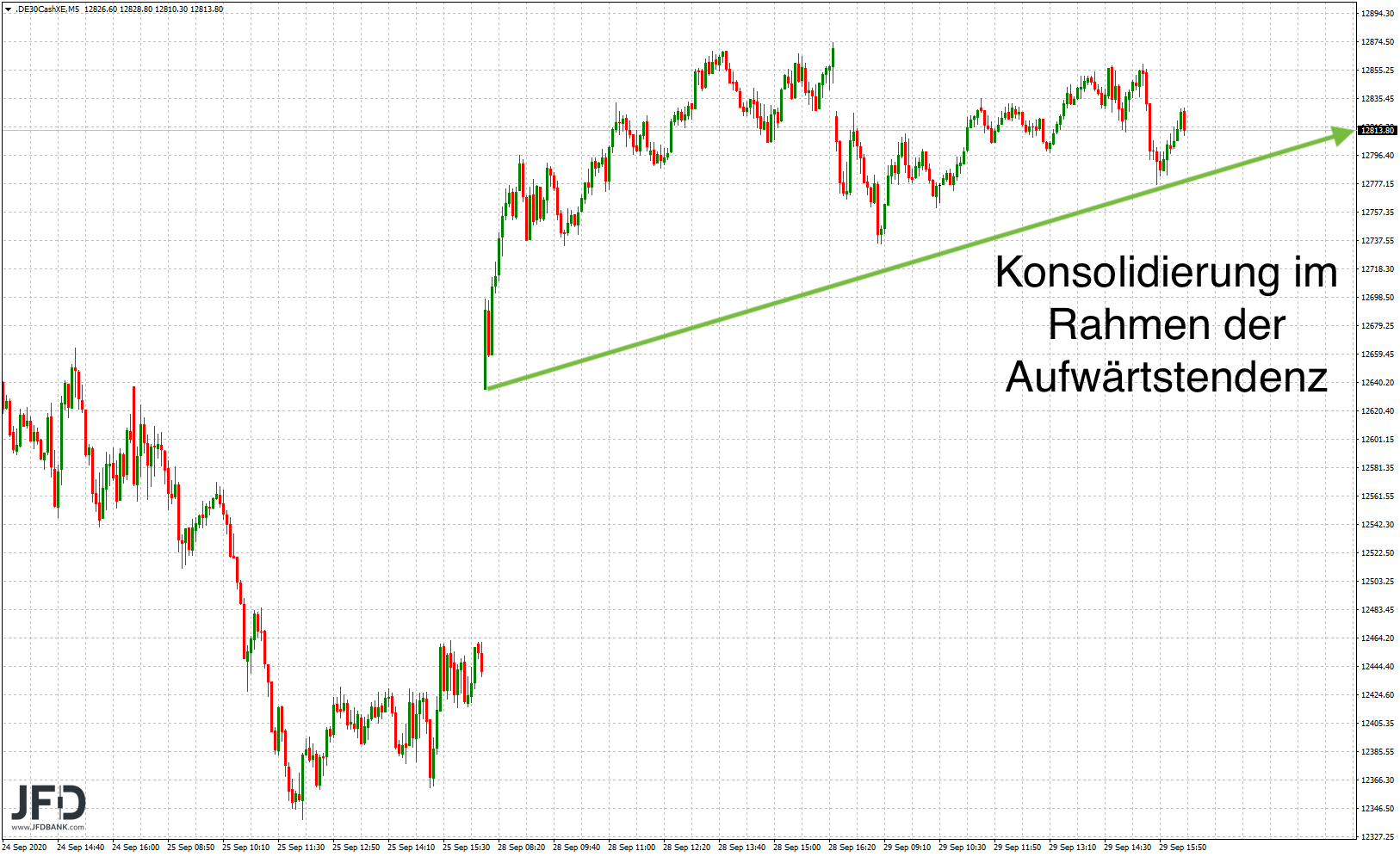 Die Bewegung vollzog sich kurz darauf weiter zum Eröffnungsniveau und nach einer Konsolidierung dort bis an die 12.850 Punkte, welche in der Vorwoche das Hoch der Konsolidierung darstellten.