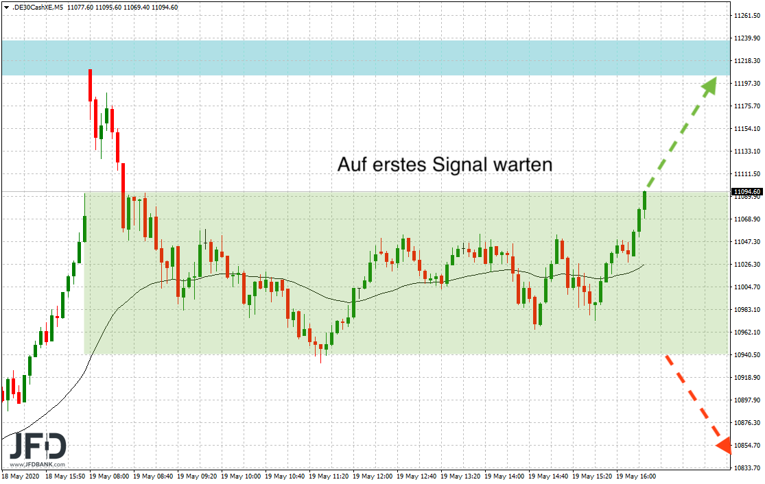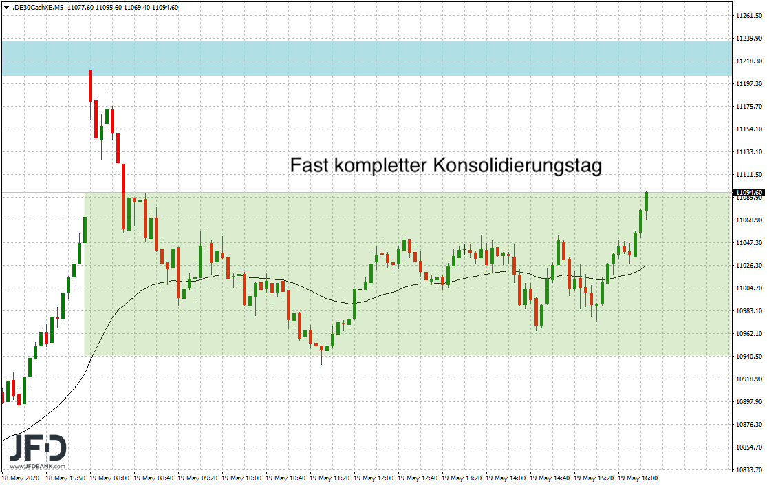 Der Dienstag darf damit als Konsolidierungstag gewertet werden. Nach einer Fortsetzung der Aufwärtsbewegung zum Handelsstart kam es zu ersten Gewinnmitnahmen. Diese schlossen das GAP in der ersten Handelsstunde und führten über den Umweg eines neuen Wochenhochs bei 11.201 Punkten dann direkt zum Konsolidierungsziel aus der gestrigen Analyse: