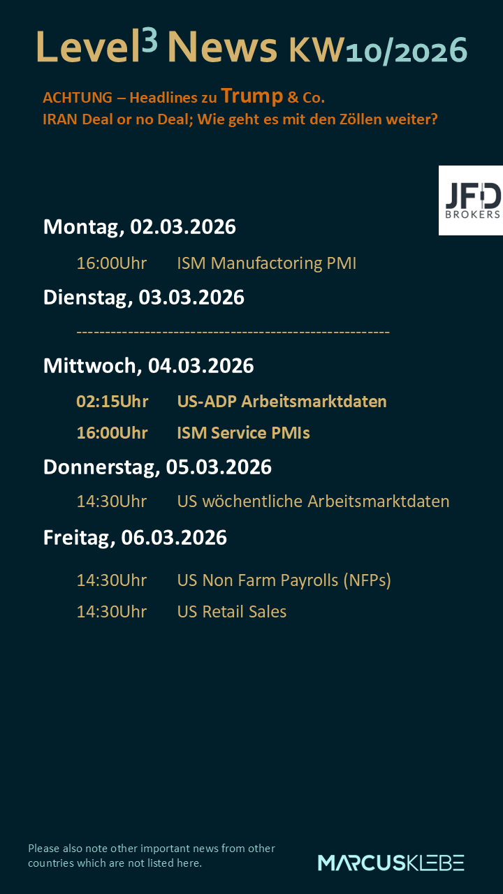 In der kommenden Woche stehen mehrere eng beobachtete US-Wirtschaftsindikatoren im Mittelpunkt, darunter PMI-Werte, ADP-Beschäftigungsdaten und die Nonfarm Payrolls am Freitag, die zusätzliche Einblicke in die aktuellen wirtschaftlichen Bedingungen bieten könnten. Gleichzeitig bleiben die geopolitischen Spannungen zwischen den Vereinigten Staaten und dem Iran hoch. Laufende Verhandlungen sind von Unsicherheit über die regionale Stabilität begleitet, was zu erhöhter Volatilität auf den Finanzmärkten beitragen kann.