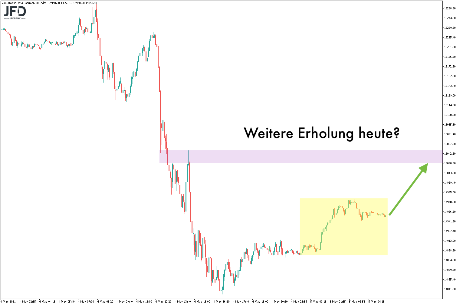 Diese Bewegung könnte ausgebaut werden und mit der Überschreitung der 15.000 auch das Konsolidierungsniveau vom gestrigen Nachmittag wieder angelaufen werden. Dort hatte ich gestern eine Short-Positionierung im Livetrading umgesetzt, die leider nach der ersten Stopversetzung aus dem Markt flog.