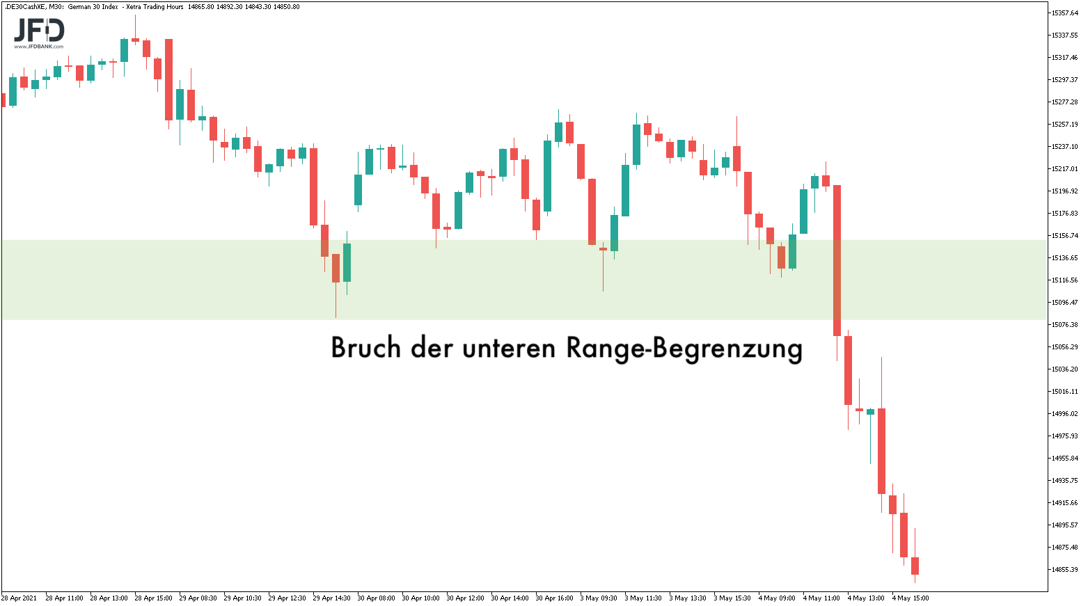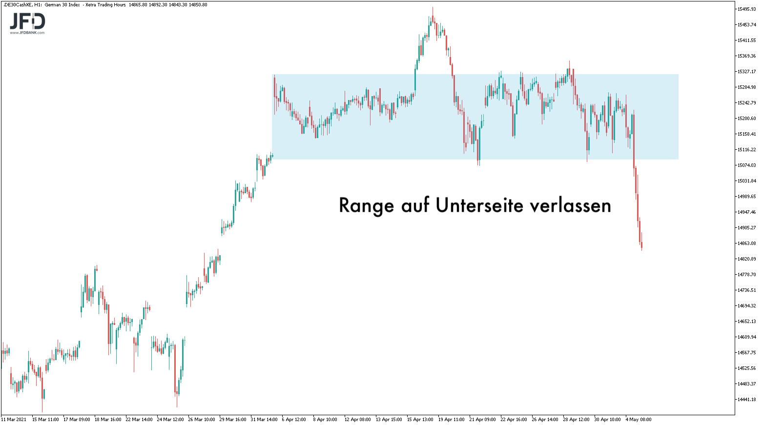 In dessen Folge fiel der DAX direkt zur unteren Range-Kante der letzten Wochen und brach diese. Zügig wurde die runde 15.000er-Marke erreicht und unterschritten.