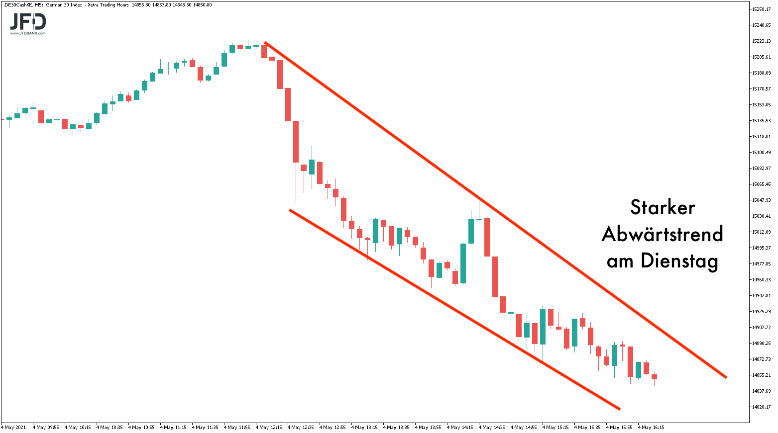 Nach mehreren Tagen ohne klare Richtung innerhalb eines Handelstages oder sogar einem Reversal zwischen den Tageshälften, wie wir am Montag gesehen hatten, hat sich der DAX am Dienstag für einen eindeutigen Trend entschieden.
