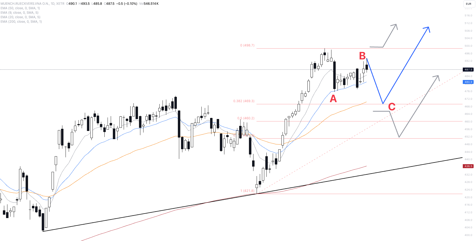 Aus technischer Sicht befindet sich die Munich Re-Aktie in einer steilen Rallye, die die Aktie innerhalb dieses Jahres immer wieder auf neue Allzeithochs führte. Aktuell notiert sie bei 487,50 Euro. Neue Allzeithochs sollten in Kürze wieder anstehen. Allerdings ist eine C-Welle auf 470 das aktuelle Primärszenario. Von dort sollte es dynamisch wieder Richtung 500 Euro und darüber hinaus gehen. Eine direkte Welle über 500 Euro ist das Alternativszenario.