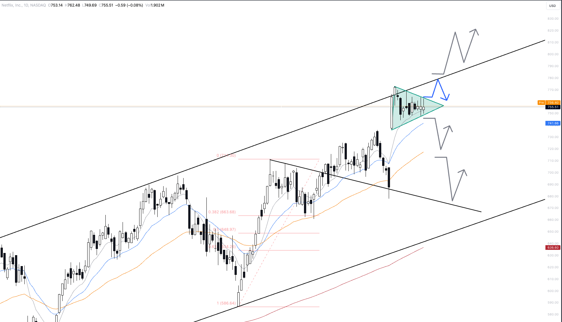 Allerdings verläuft dieser auf hohem Niveau und eng an der oberen Trendkanalbegrenzung. Lehrbuchmäßig würde sich der Wimpel auf der Oberseite auflösen und die Aktie eine neue Rallyephase einleiten. Unser Hauptszenario sieht zwar einen Bruch auf der Oberseite vor, ohne jedoch eine mehrwöchige Rallye einzuläuten. Vielmehr geht es davon aus, dass die Trendkanalbegrenzung erst mal eine Hürde darstellt. Sollte die Aktie dennoch über 785 USD ausbrechen, so könnte in Kürze die 800 USD als Ziel dienen. Bricht der Wimpel auf der Unterseite, so löst es ein Nebenszenario aus, dass der Aktie Abwärtspotenzial bis 720 USD und später 680 USD beschert.