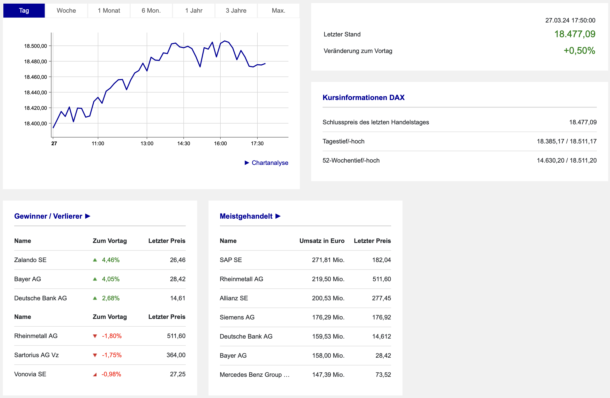 Mit 18.477 Punkten erfuhr der DAX dann am Tag 6 der Rekordserie ein neues Level, welches anhand der Daten der Börse Frankfurt an dieser Stelle noch einmal dokumentiert ist: