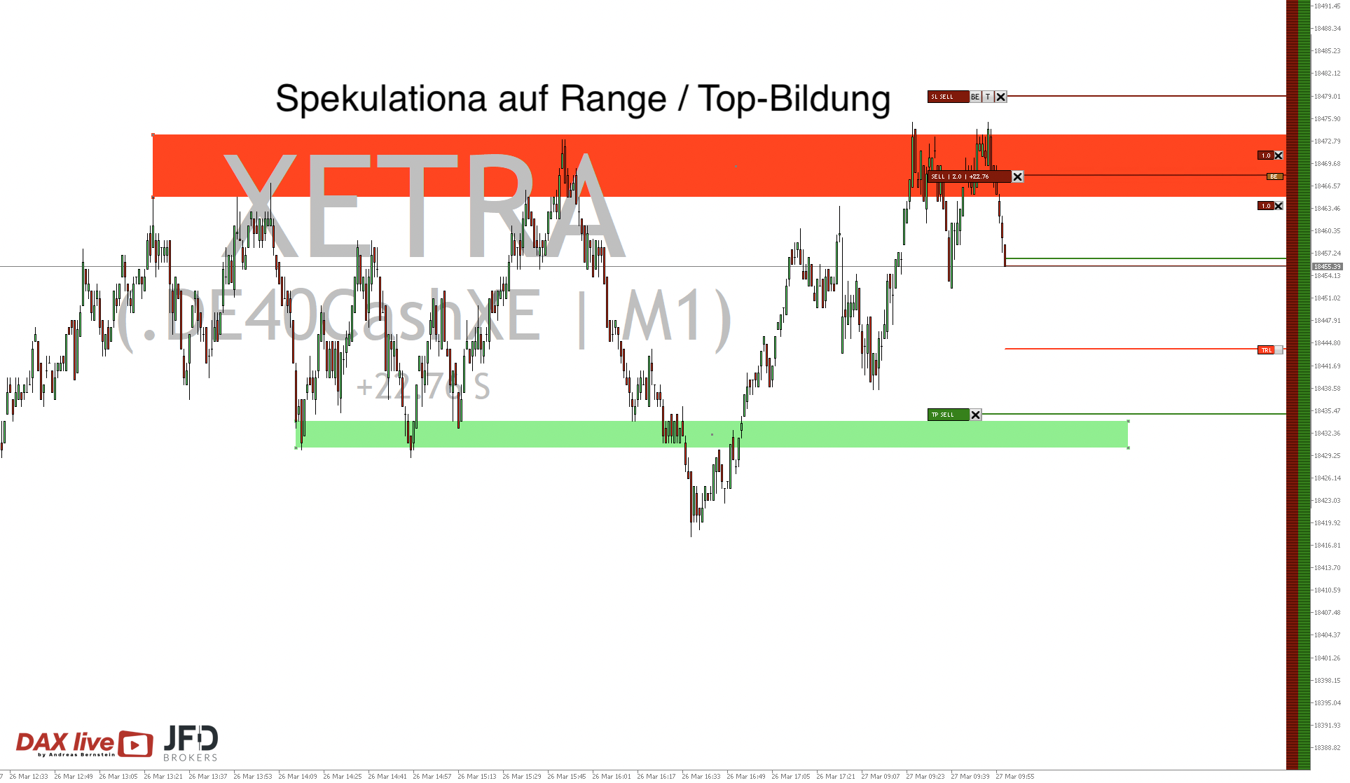 Für den Dow Jones skizzierte sich bereits zum Start ein starker Handel, welcher aber auch noch einmal an die Startpunkte zurückkam. Genau diese Bewegung handelten wir im Livetrading am Nachmittag mit einer Stopp Sell Order.