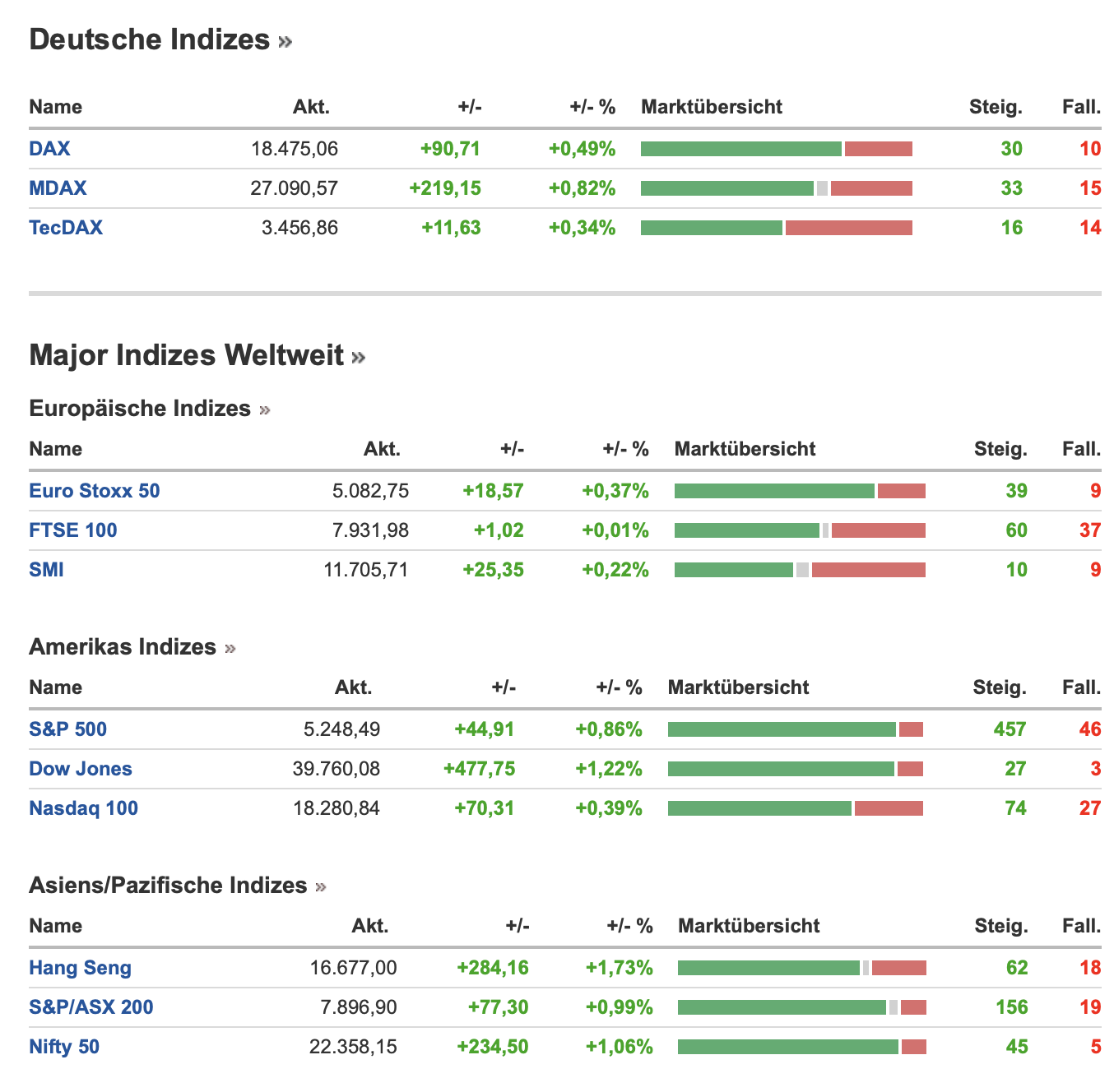 Damit hellt sich zumindest auch die Statistik wieder auf, welche international nun eine breite Anzahl an Indizes im positiven Bereich zeigt: