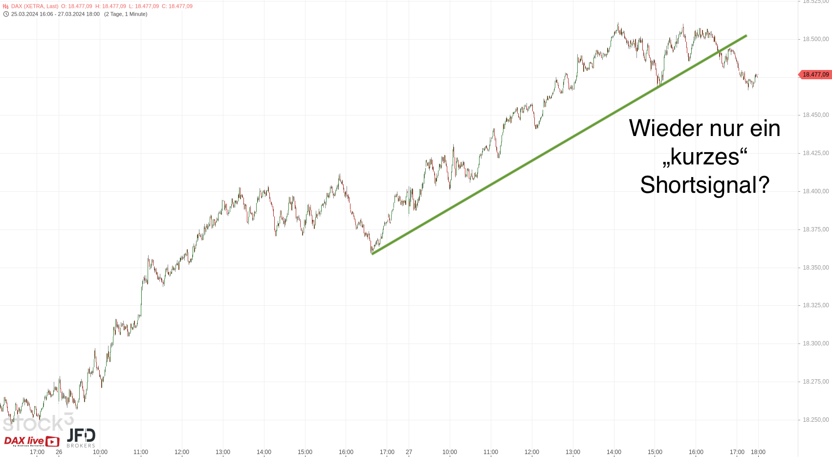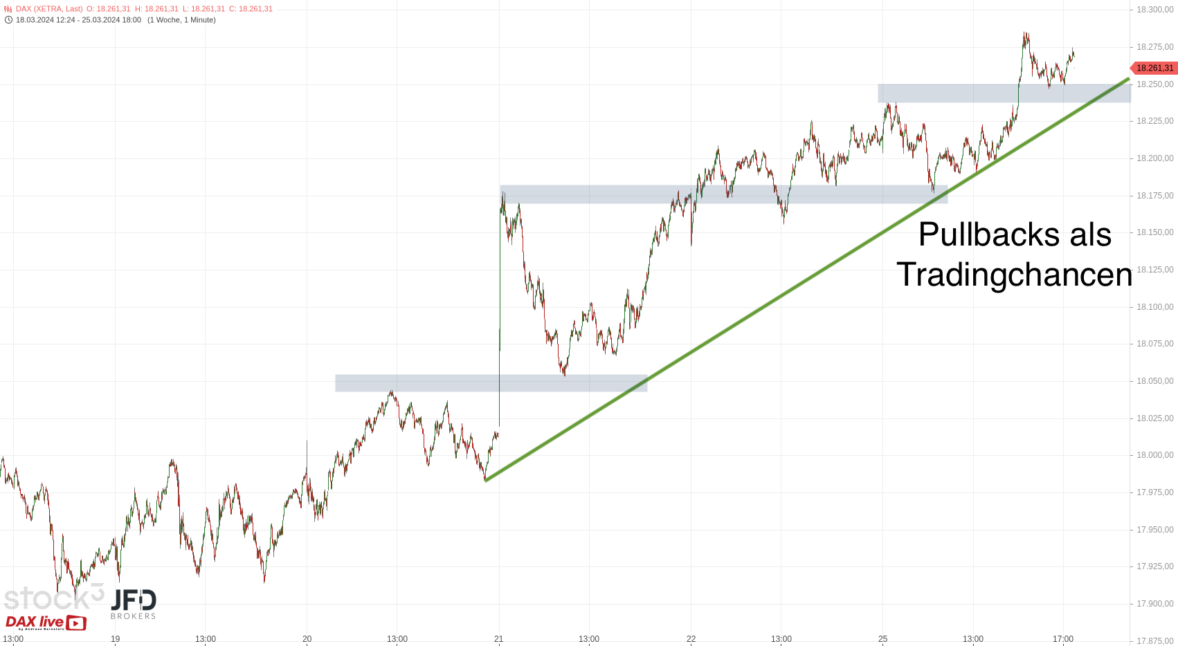 Wir fassten in der Morgenanalyse zum 26.03.2024 bereits die Dynamik auf der Oberseite zusammen und fanden heraus, dass Konsolidierungen immer im Rahmen der Trenddynamik schnell beendet wurden (Rückblick):