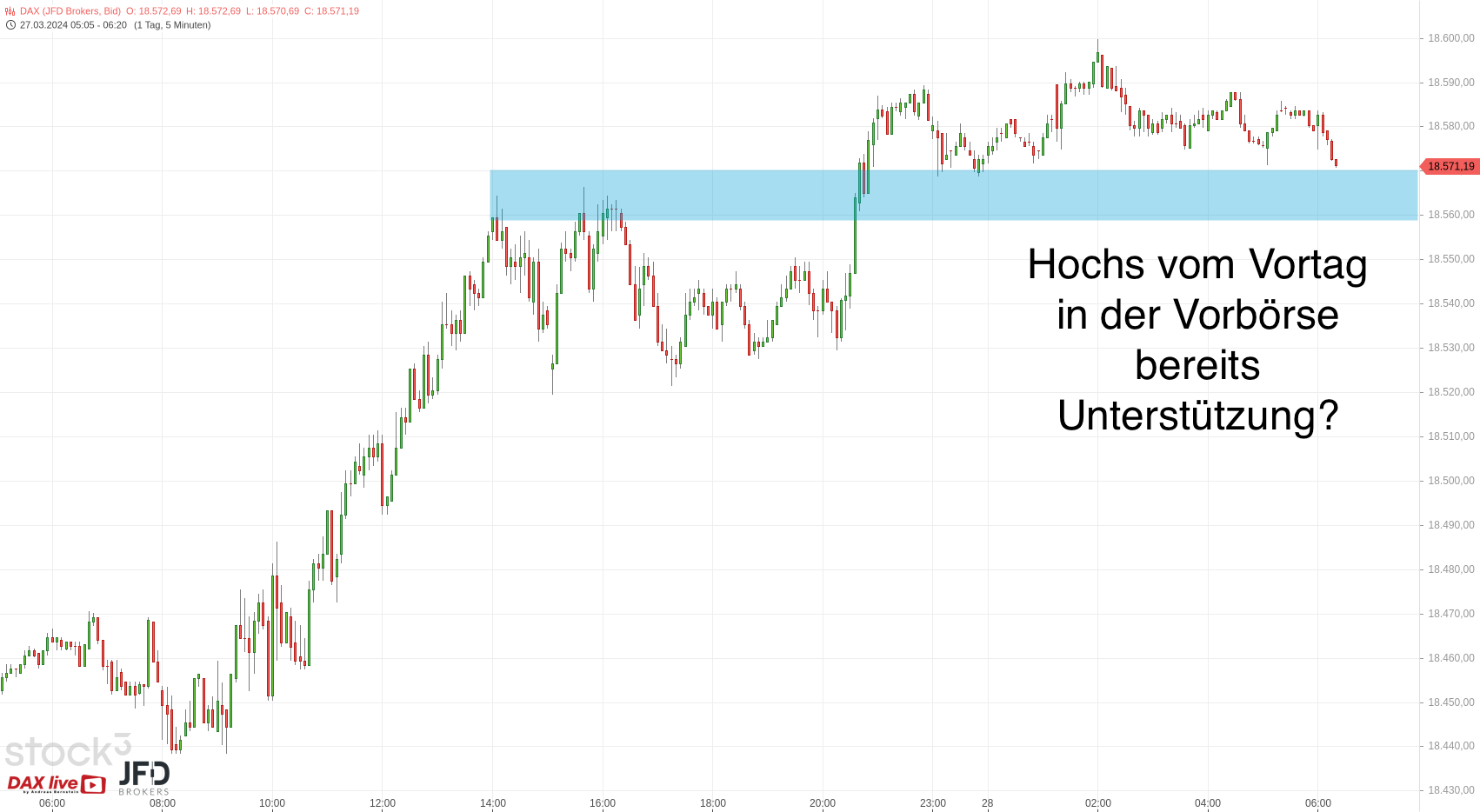 So ging es am Dienstag und nun auch am Mittwoch weiter. Konsolidierungen sind für den Markt aktuell willkommene Einstiegspunkte im Trend nach oben. So war das Überschreiten der 18.400 kein Top am Dienstag und zum Mittwoch standen wir bereits über 18.500 Punkten.