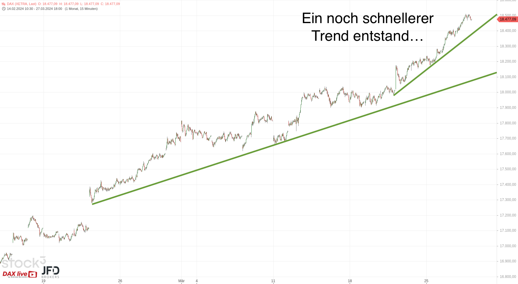 Übergeordnet sprachen wir gestern vom Verlassen des Trendkanals auf der Oberseite. Dies führte zu einer neuen Trendlinie, die nun noch steiler verläuft: