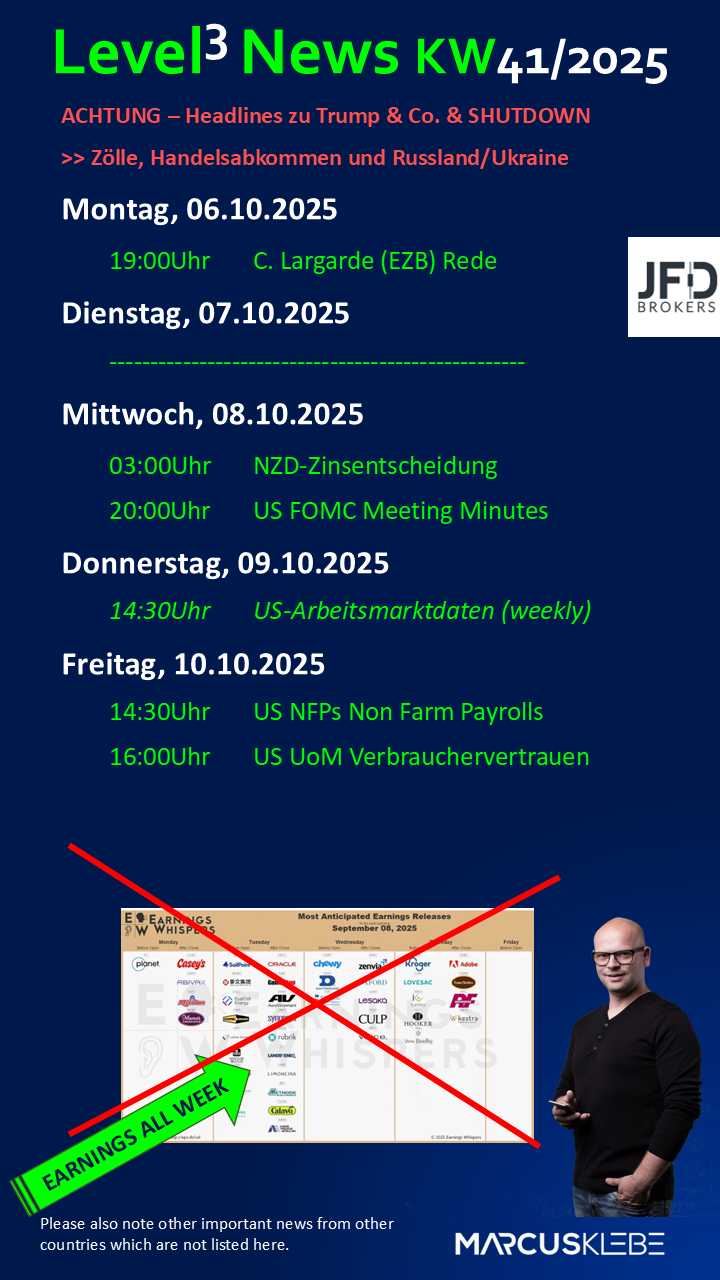 Zusammenfassend bleibt festzuhalten: Die Märkte blicken gespannt auf die RBNZ-Zinsentscheidung und die Arbeitsmarktdaten am Freitag – ob die US-Zahlen erscheinen, hängt jedoch direkt vom weiteren Verlauf des Government Shutdowns ab.