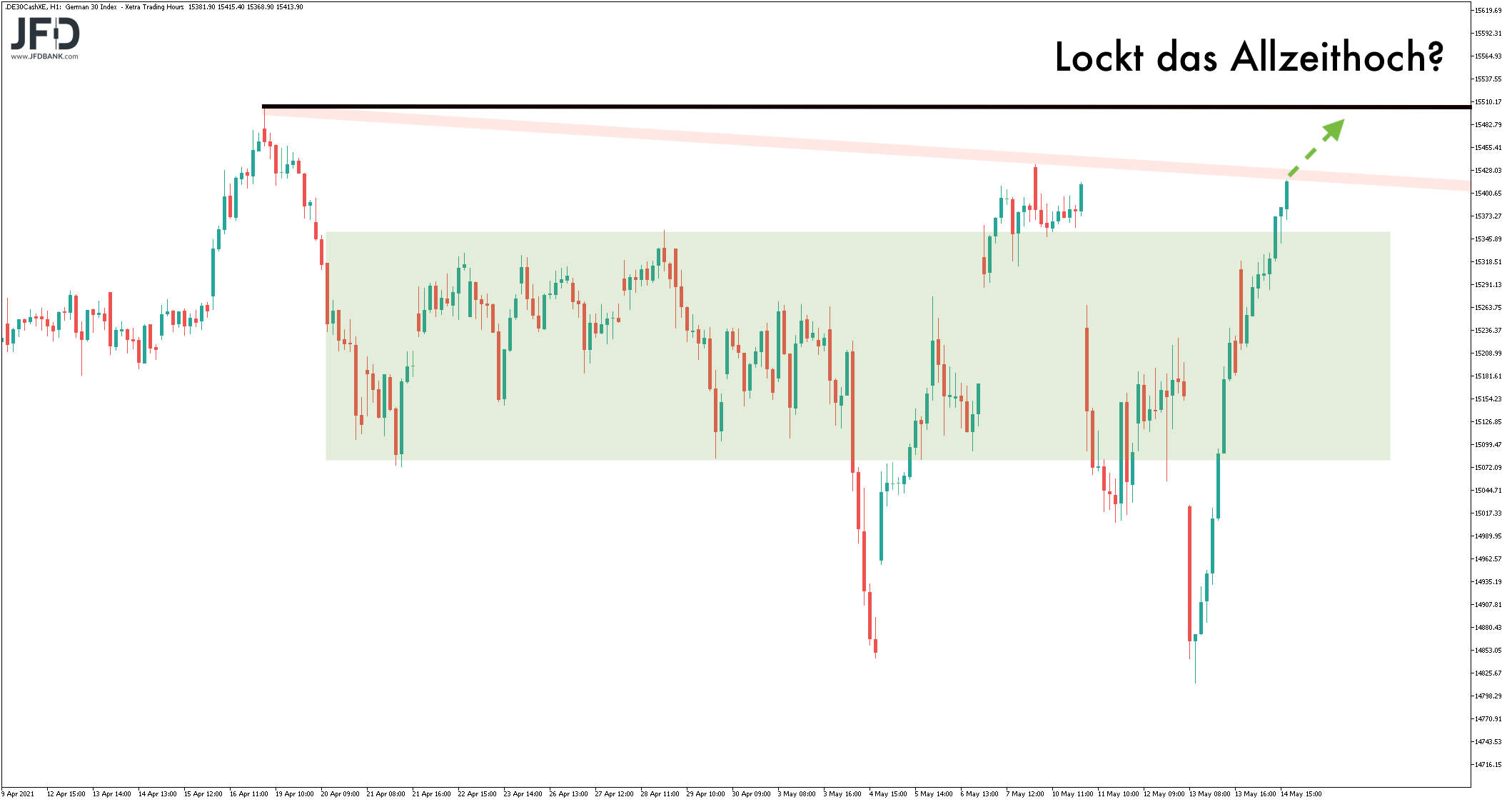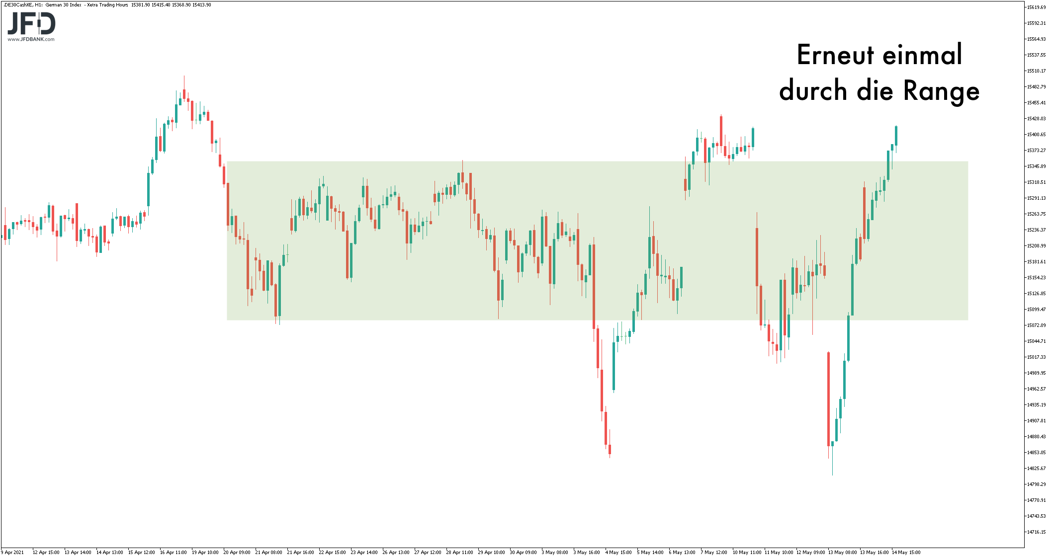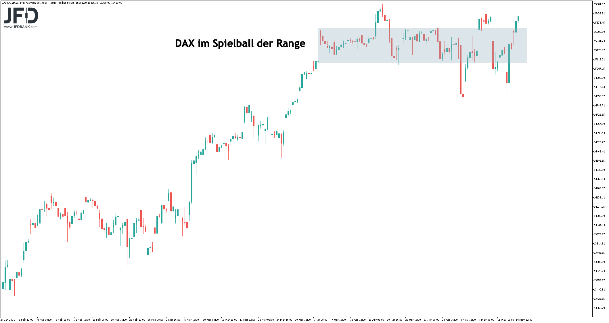 In der Region 15.400 ist dies ebenso wieder möglich. Immerhin lief sich der DAX dort bereits Anfang Mai sinngemäß fest.