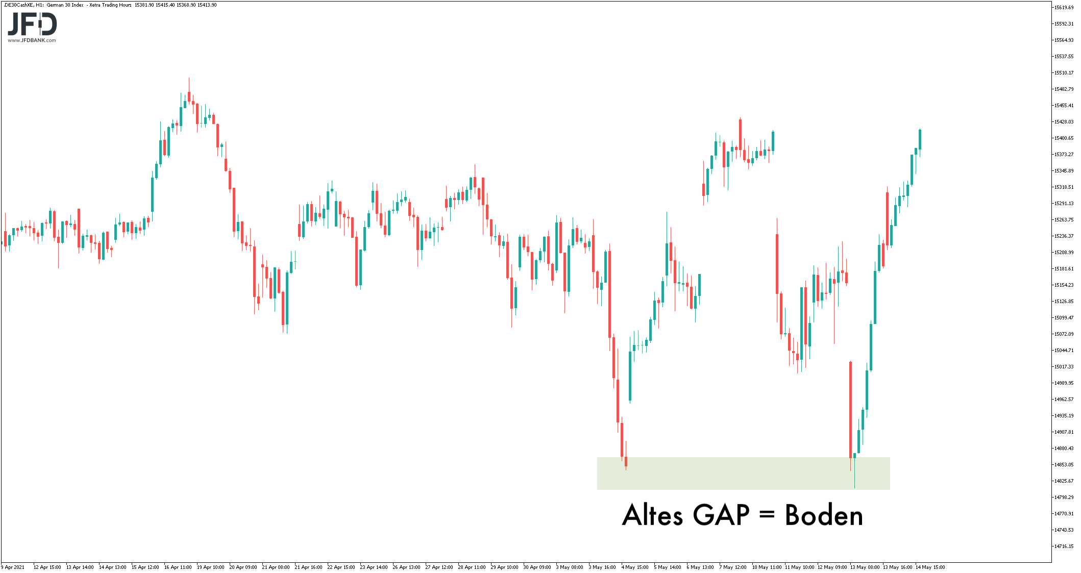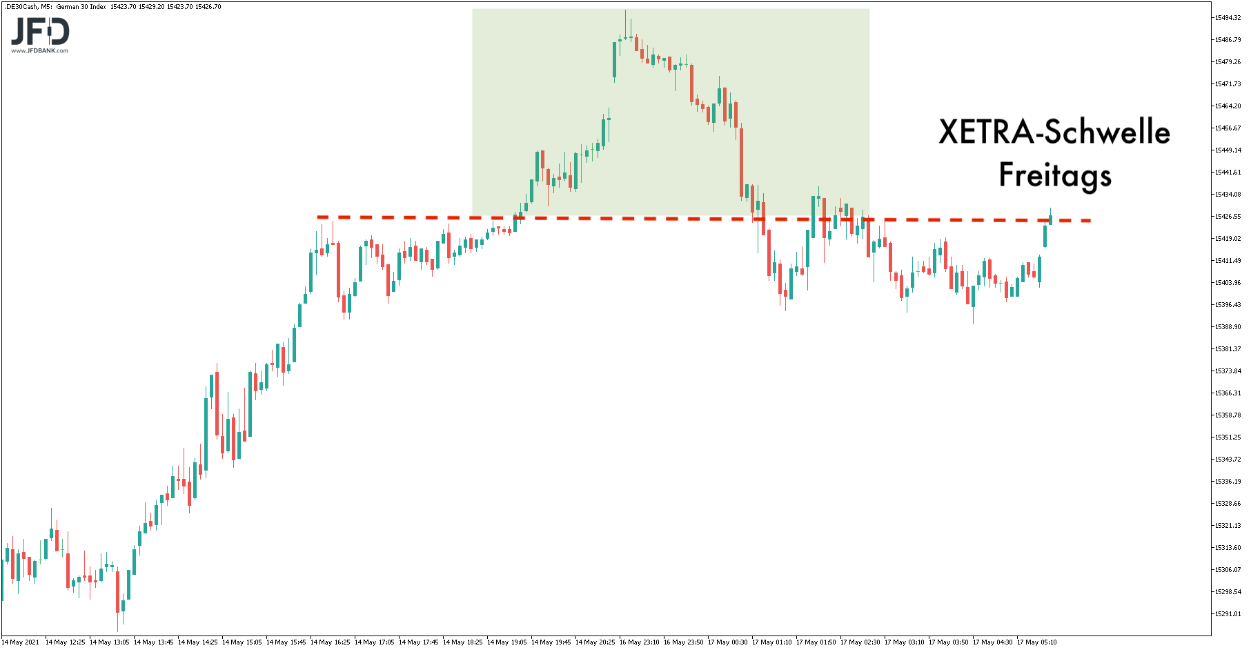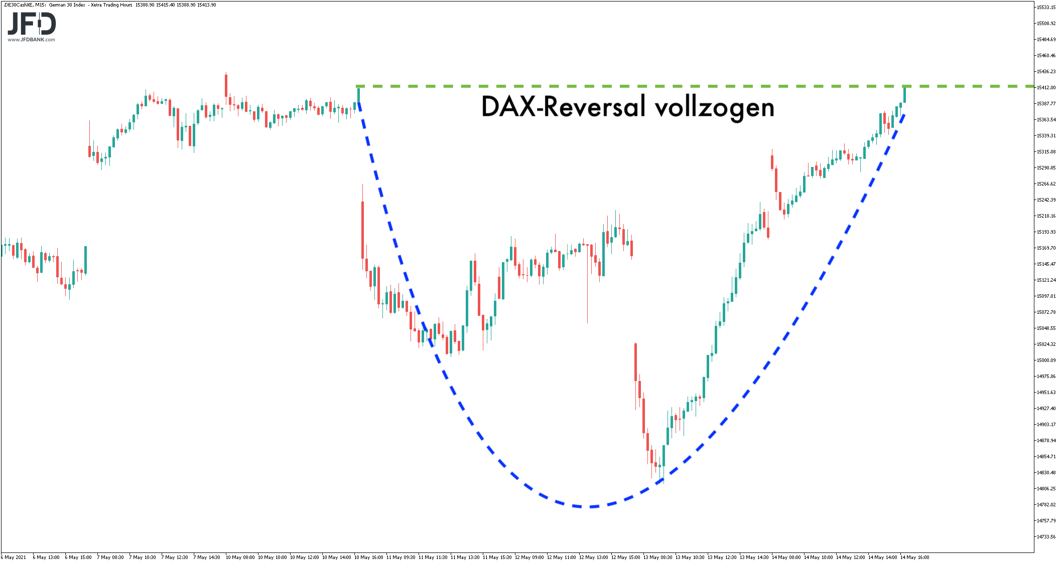 In der Region 15.400 ist dies ebenso wieder möglich. Immerhin lief sich der DAX dort bereits Anfang Mai sinngemäß fest.