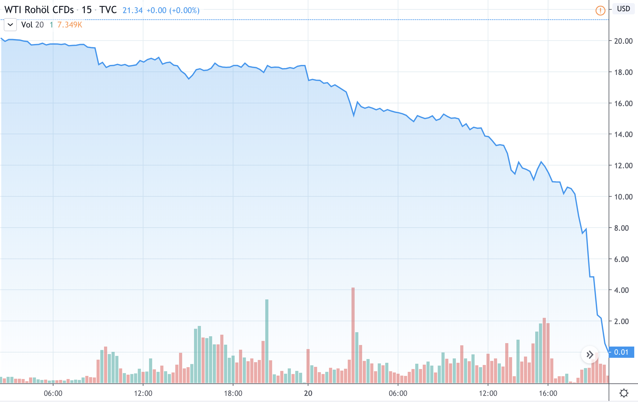Die Wall Street ergab sich am Abend den Bären und vor allem dem Schock, den der Verfall des Öl-Futures aus Mai auslöste. Hier sah man negative Kursnotierungen und einen Future-Kontrakt, den sinngemäß niemand mehr haben wollte: