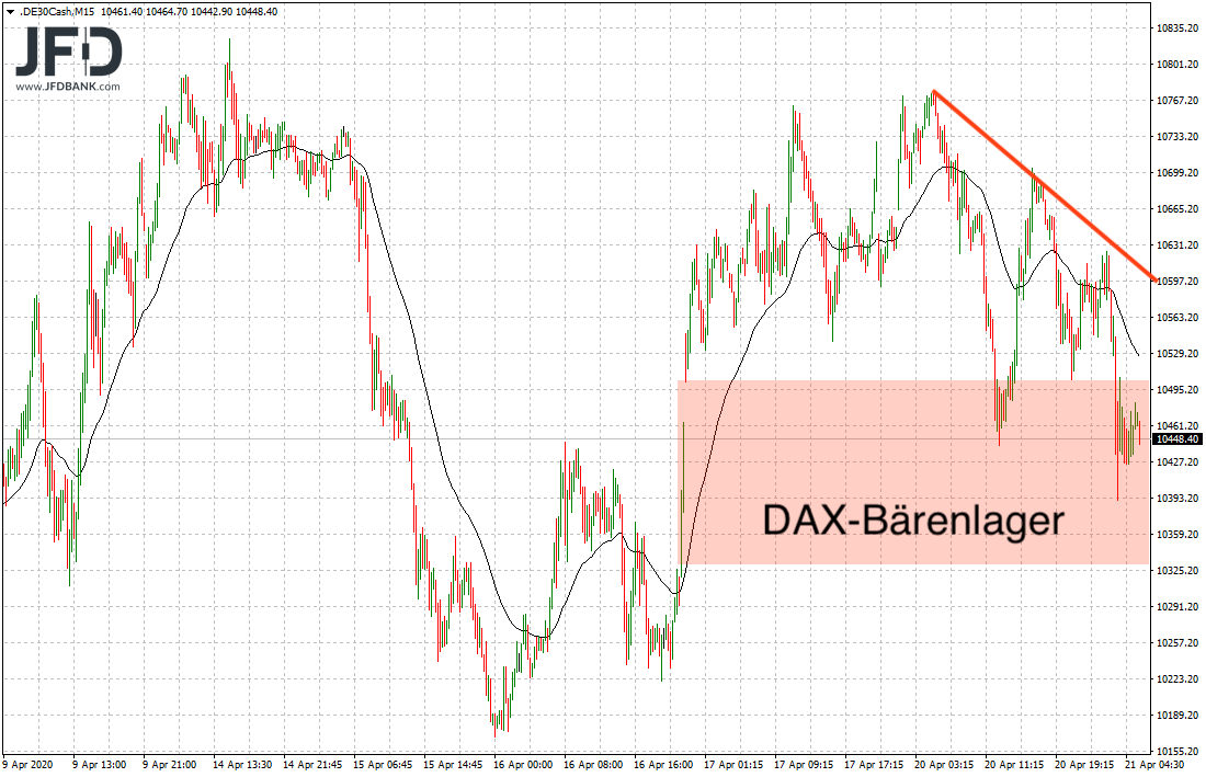 Durch diesen weitestgehend roten Tag, der nur am Ende einen Kursgewinn rettete, bleibt die Abwärtstrendlinie im XETRA-Chart seit dem Vorwochenhoch um 10.800 Punkten als Widerstand bestehen: