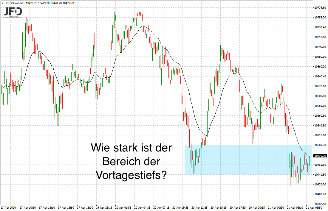 Im Nachthandel hat sich der Anstieg vom gestrigen Nachmittag wieder neutralisiert. Wir notieren fast genau auf dem Vortagestief und mit 10.450 Punkten auf der besprochenen Linie, die uns bereits mehrfach beschäftigte.