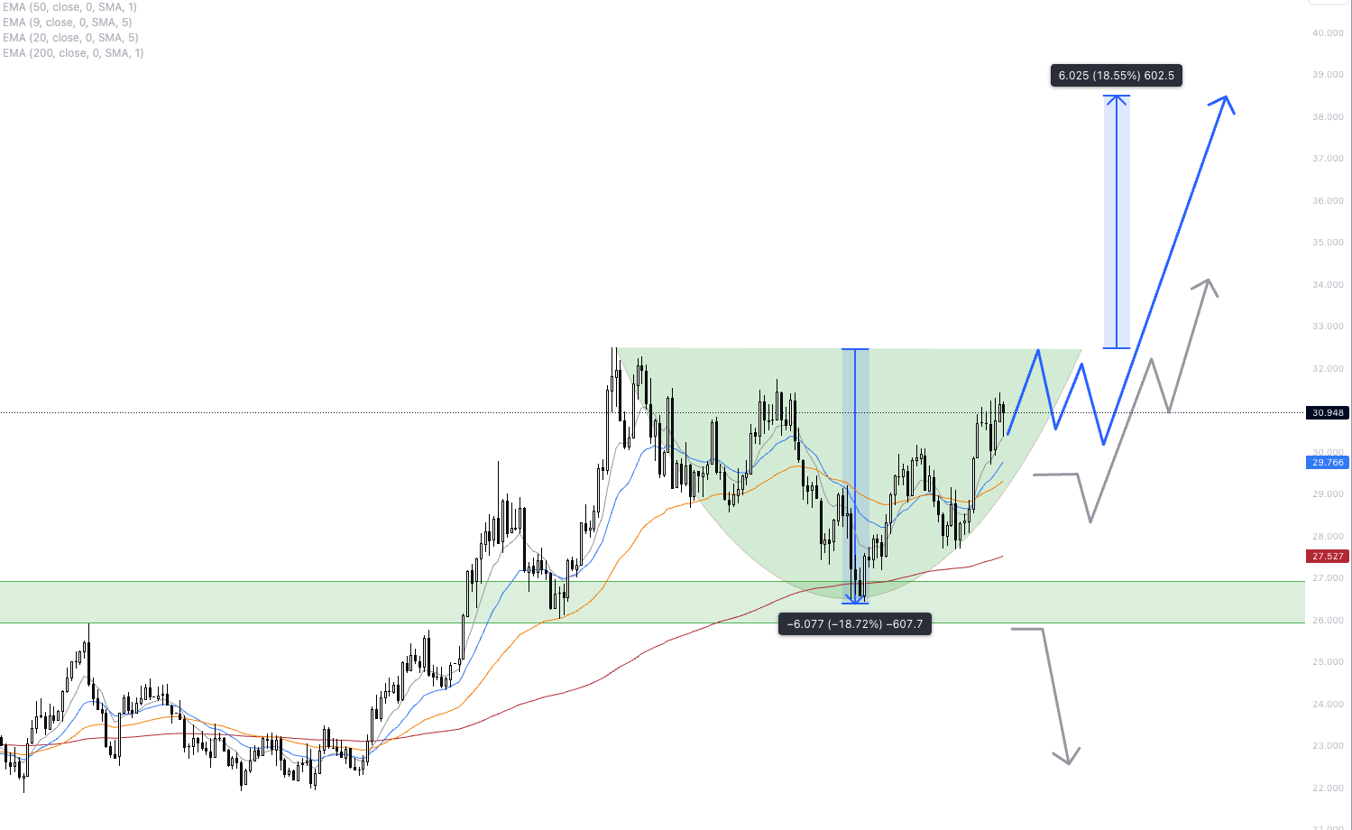 Auf der Unterseite stehen viele Unterstützungen bereit. Unter 29,50 USD würde ein erneutes anlaufen des EMA 200 wahrscheinlich. Wirklich bärisch wird es erst unter 26 USD.