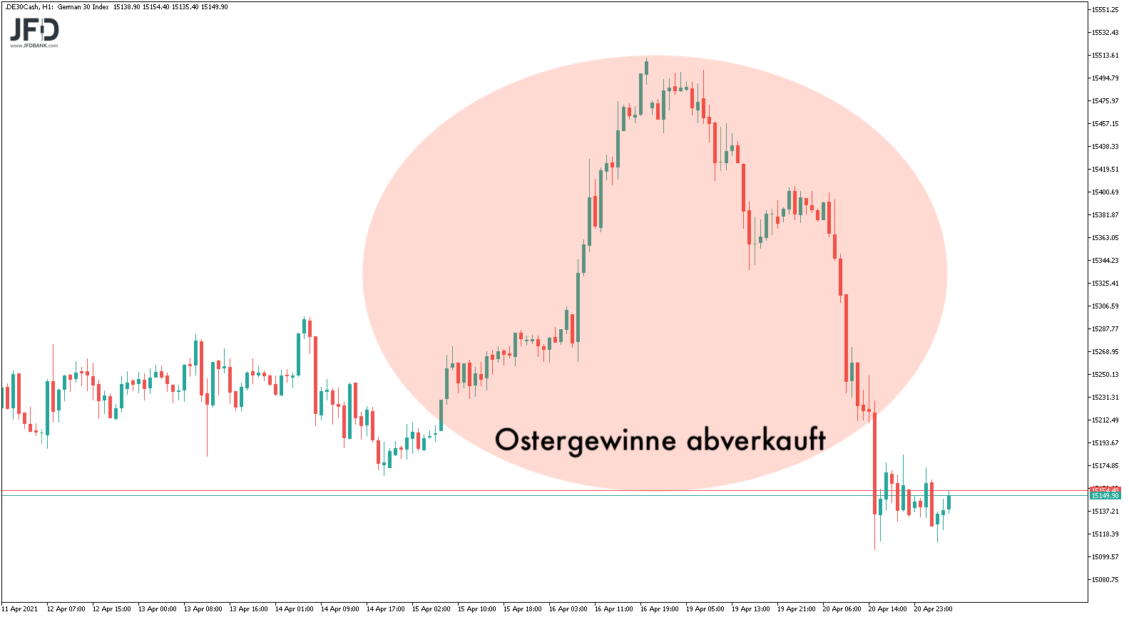 Immerhin hielt der Markt an dieser GAP-Kante vom 1. April an. Dieser Tag hatte als Hochpunkt die 15.110 Punkte, als Schlusskurs die 15.107 und damit lag das gestrige Tief von 15.109 sehr genau an diesem Punkt. Ein Hoch auf die Charttechnik mit Blick auf die Parameter gestern:
