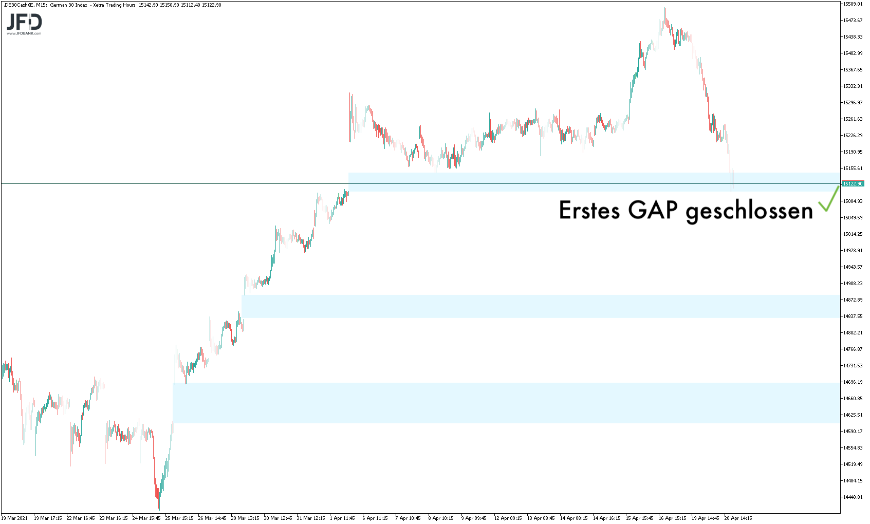 Zum Wochenstart sprachen wir noch über die Größe einer möglichen Korrektur, nun ist dies erst einmal vom Markt beantwortet. Es blieb nicht beim minimalen Pullback auf das Ausbruchsniveau, welches beim alten Rekordhoch von 15.311 Punkten lag. Vielmehr brach diese Schwelle im gestrigen Handelsverlauf und generierte weiteres Abwärtspotenzial (Rückblick):