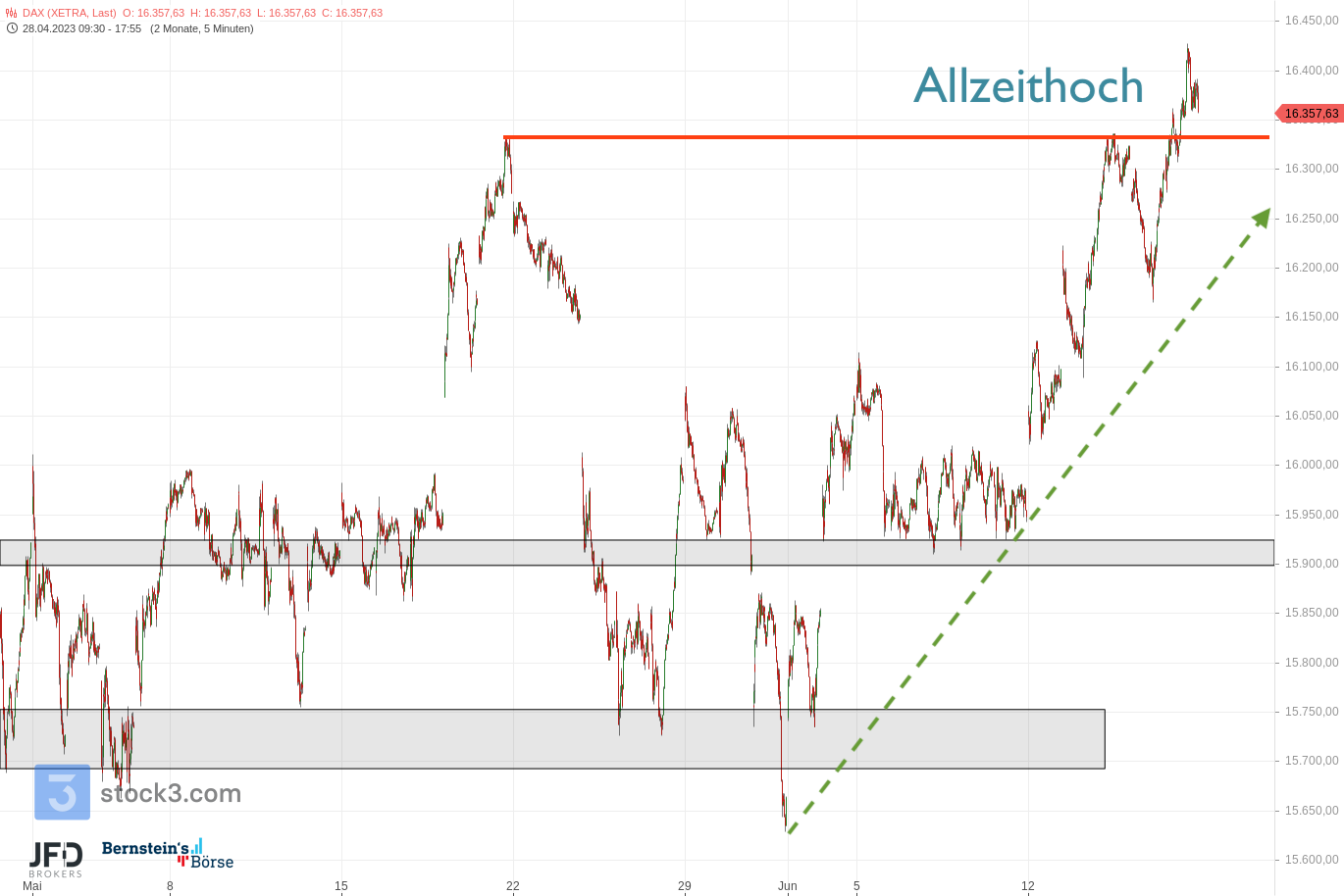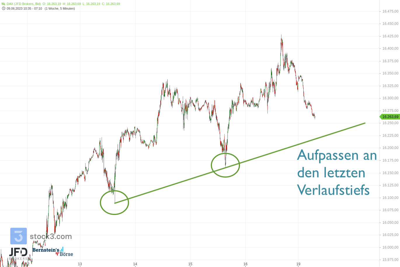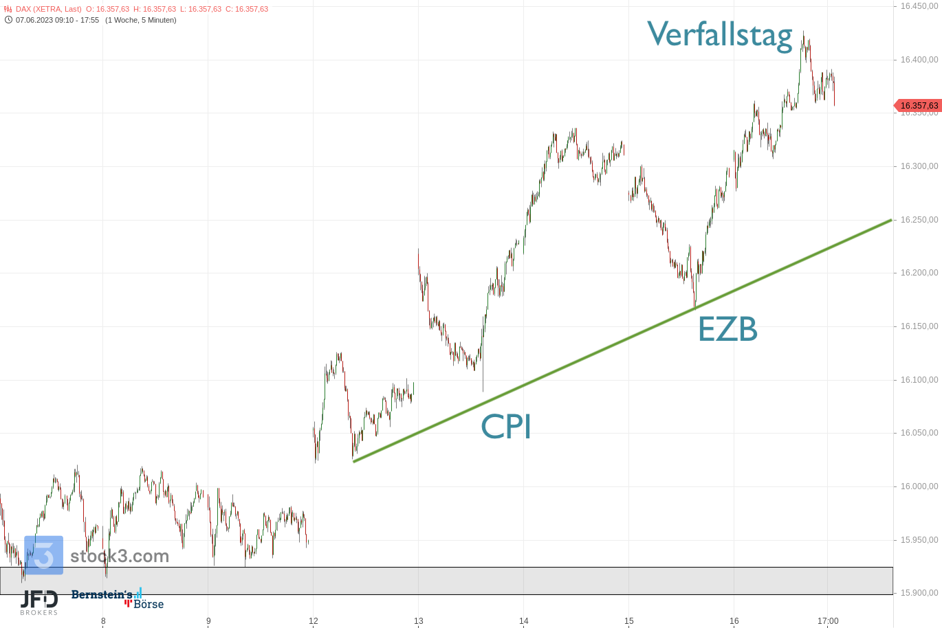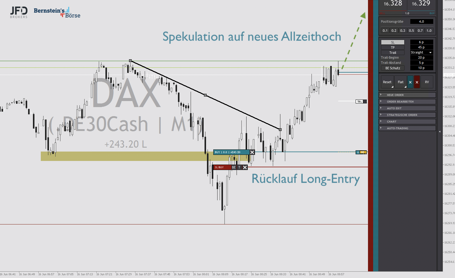 Eine kleinere Korrektur stellte sich am Freitagmorgen ein, die ich dann im Livetrading mit einer Stopp-Buy-Order begleitete und damit deren Abschluss auf der Long-Seite handelte. Mit dem Rücklauf über 16.300 war das Szenario "neue Hochs im Trend" wahrscheinlich und skizzierte sich dann wie folgt: